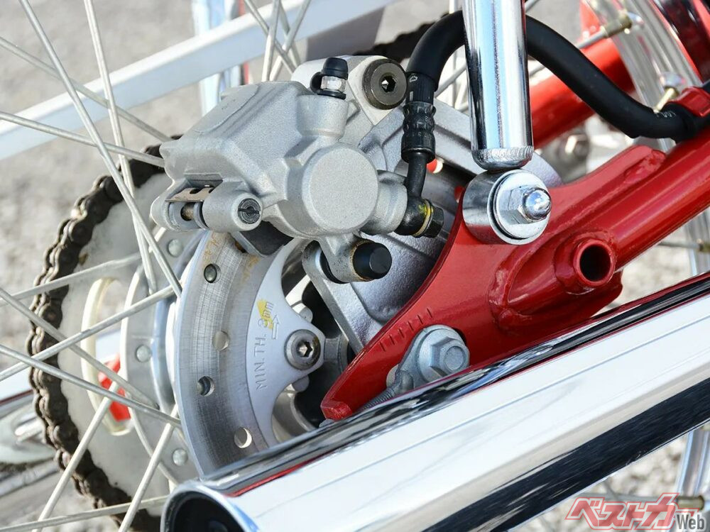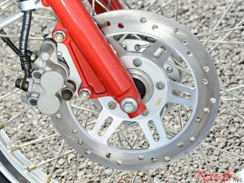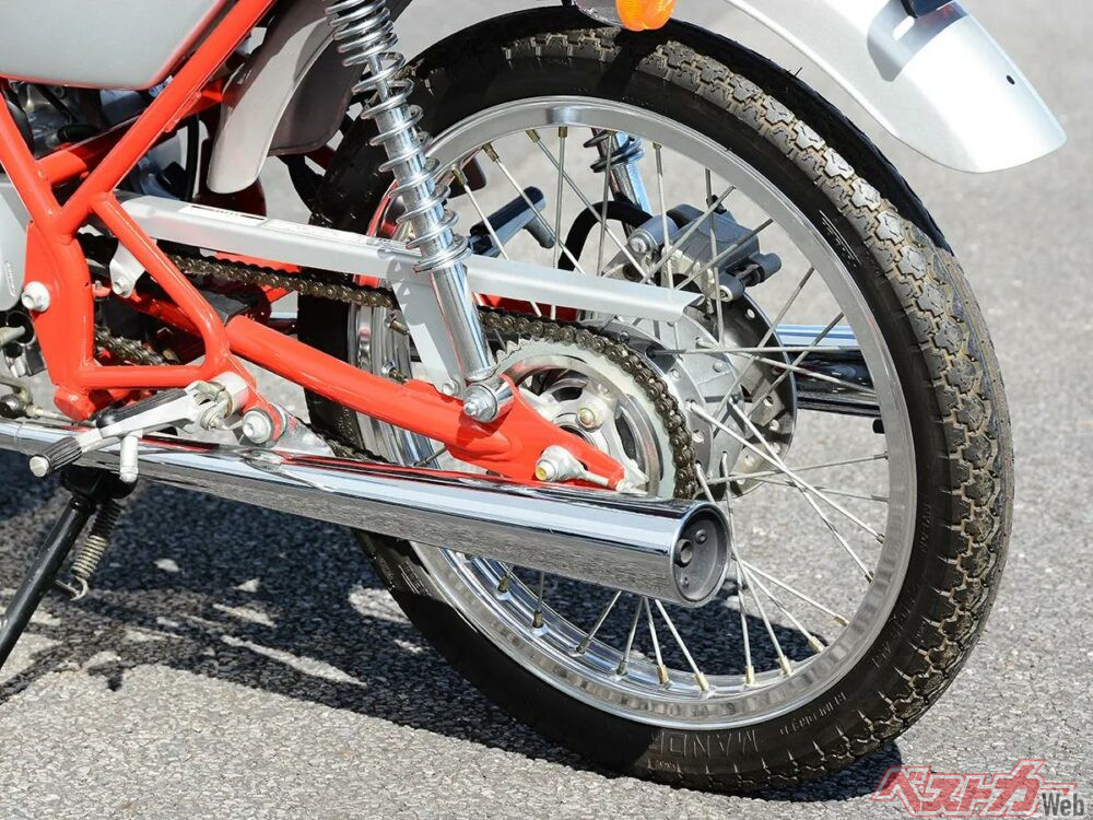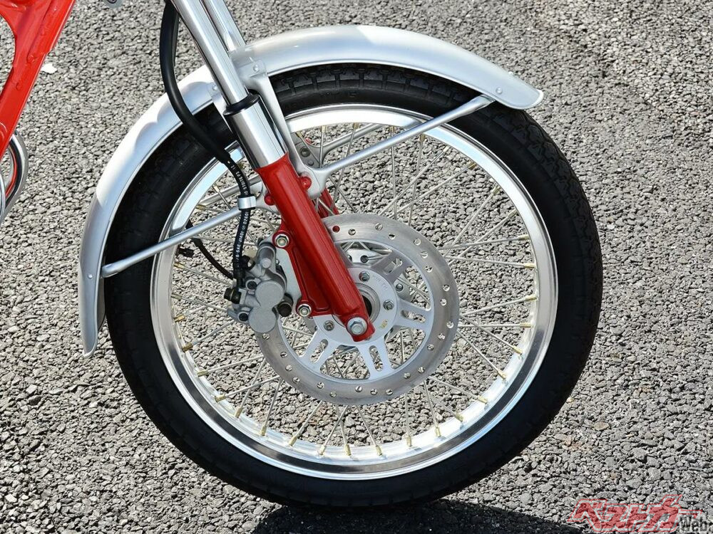 このフレームに組み合わされるサスペンションは、フロントにインナーチューブ径27mmの正立フロントフォーク、リアにツインショック+スチール製スイングアームとなる。ホイールサイズは前後18インチで、軽量で剛性に優れたH型断面アルミリムを採用したスポークホイールとなる。ブレーキは前後ディスクタイプとされ、フロントは240mm径ディスク+2ポットキャリパー、リアは190mmディスク+1ポットキャリパーとなる。