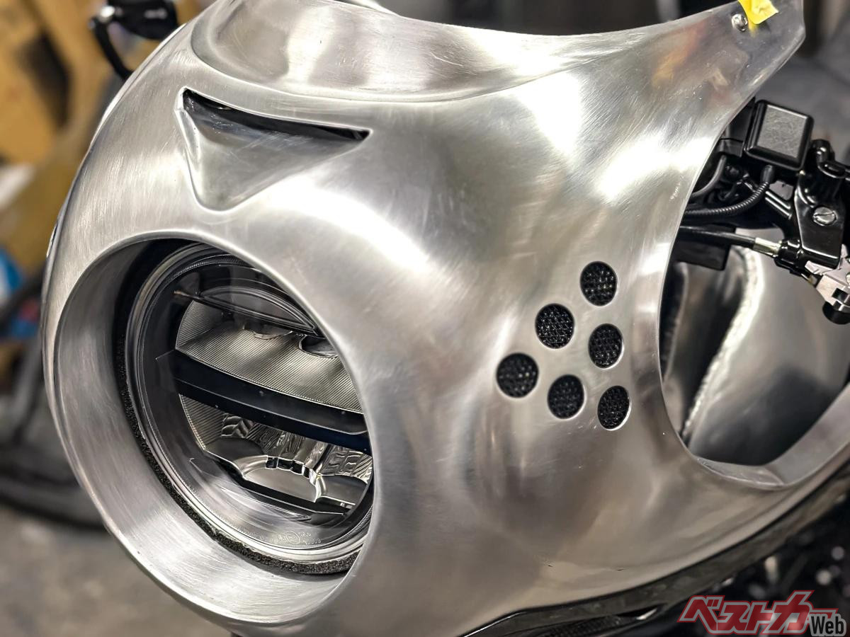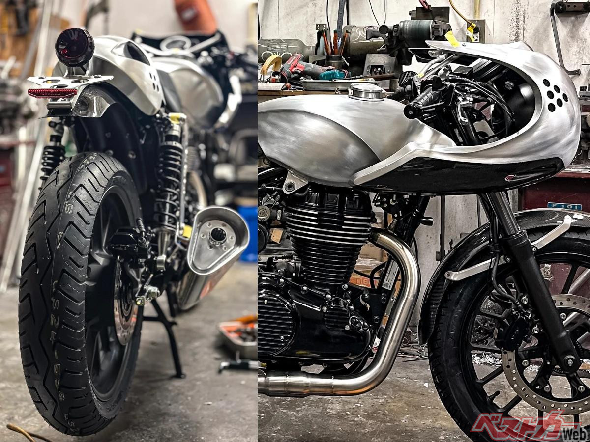 今回カスタムを手掛けたのは神奈川県藤沢市に店舗を構える「ASK MOTORCYCLE TOTAL CUSTOM SHOP」。なんと製作期間は1年を費やし、カウルやタンクといった外装パーツの多くがアルミで作られているのだ。そしてベース車両はインド版のGB350とも言える「ハイネスCB350」で、GBとは少し異なるプロフィールに苦戦した部分もあったそう。