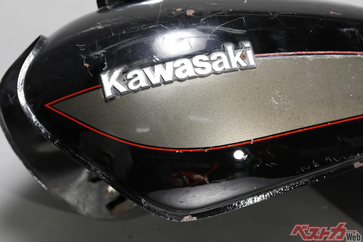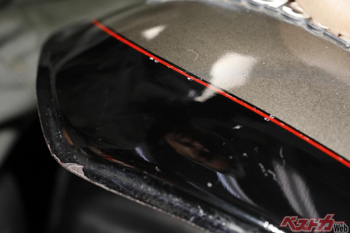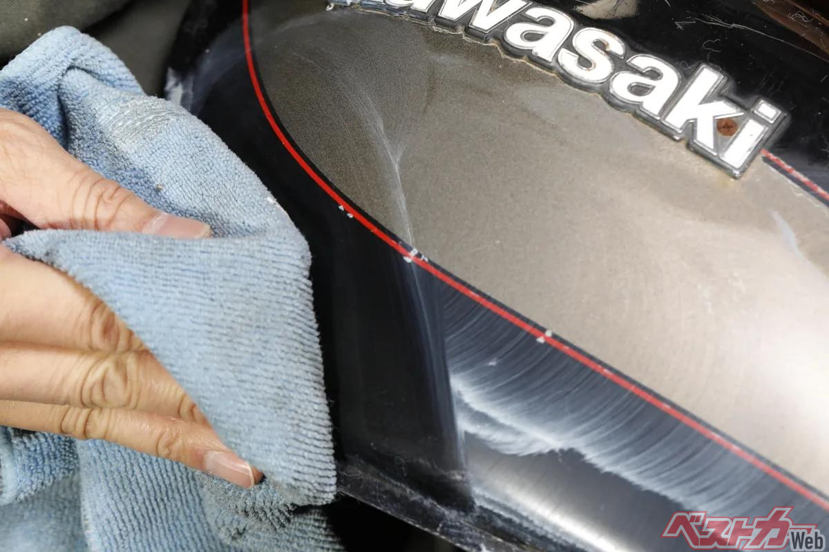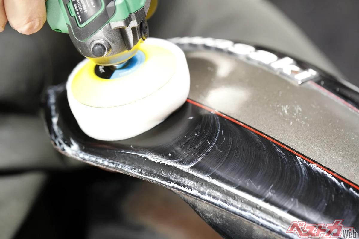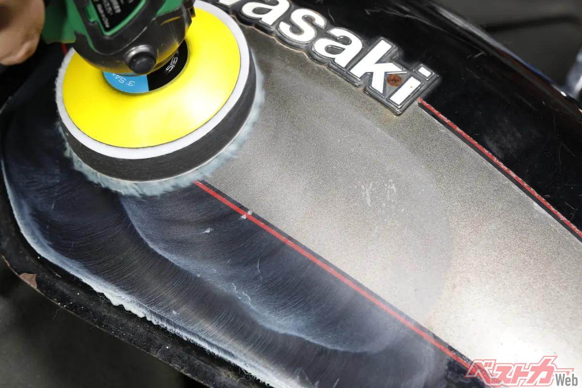 研磨したのはKawasakiのタンクエンブレムの下あたりで、上塗りのブラックもグラフィックのグレーも深みが増し、シャンプー洗車では落ちない輪ジミも完全に消えて引き締まって見える。手磨きだと指や手のひらの当たり具合によって均一に磨くのが難しいが、ポリッシャーなら面で磨けるので仕上がりが均等になる。ボンネットやドアなど磨き部分の面積が大きな自動車用は、トルクの大きいAC100Vモーターを使用したポリッシャーと直径180mmと大きなバフを組み合わせて作業することが多い。