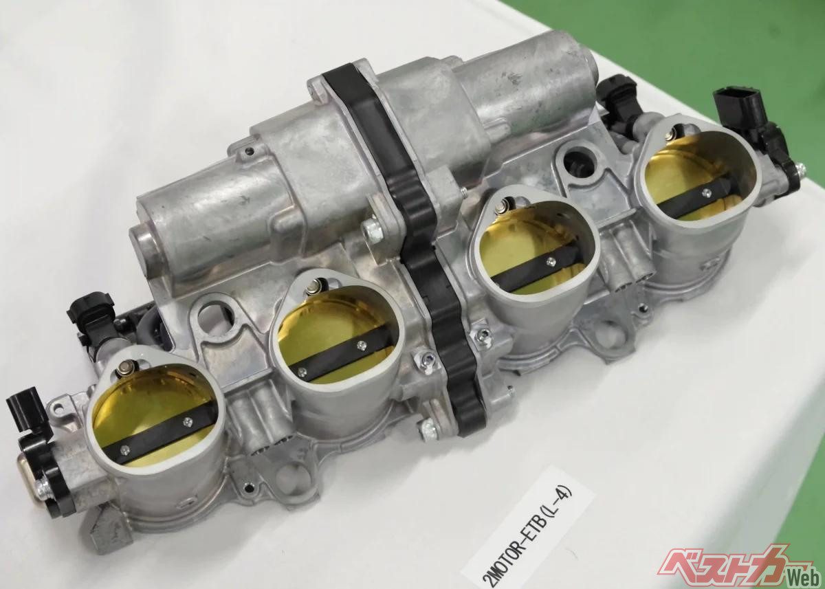 FUN系のパーツとしては、横幅を維持したまま高性能化が可能な2モーター式スロットルボディを展示。一般的にスロットルバルブの開閉は1モーターで行うが、高性能スポーツでは2つのモーターを搭載し、2気筒ごとの独立制御を実現している。