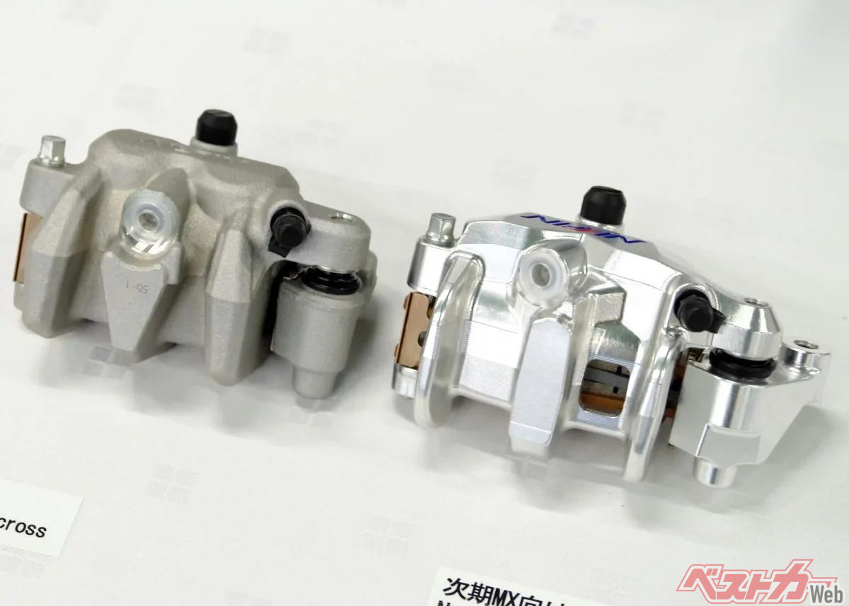 左は現行品、右は開発中のモトクロッサー向けキャリパー。ブリッジ中間部を肉抜きして軽量化を実現した。さらに有機的なリブ形状で剛性もアップしている。