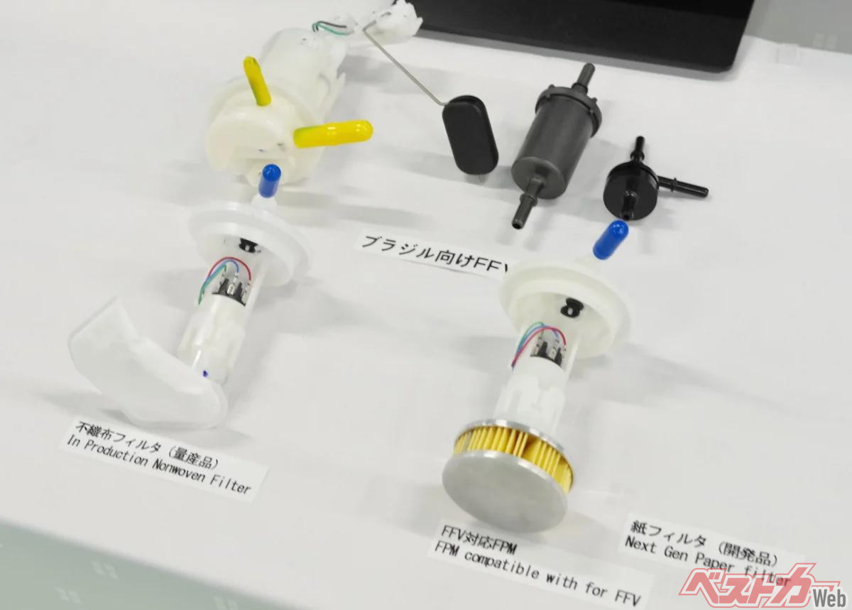 ガソリンからバイオ燃料への置き換えを実現する燃料ポンプ。紙フィルターなどで省スペースとし、最小限の変更でバイオ燃料に対応できる。同様のバイオ燃料対応インジェクターも展示されていた。