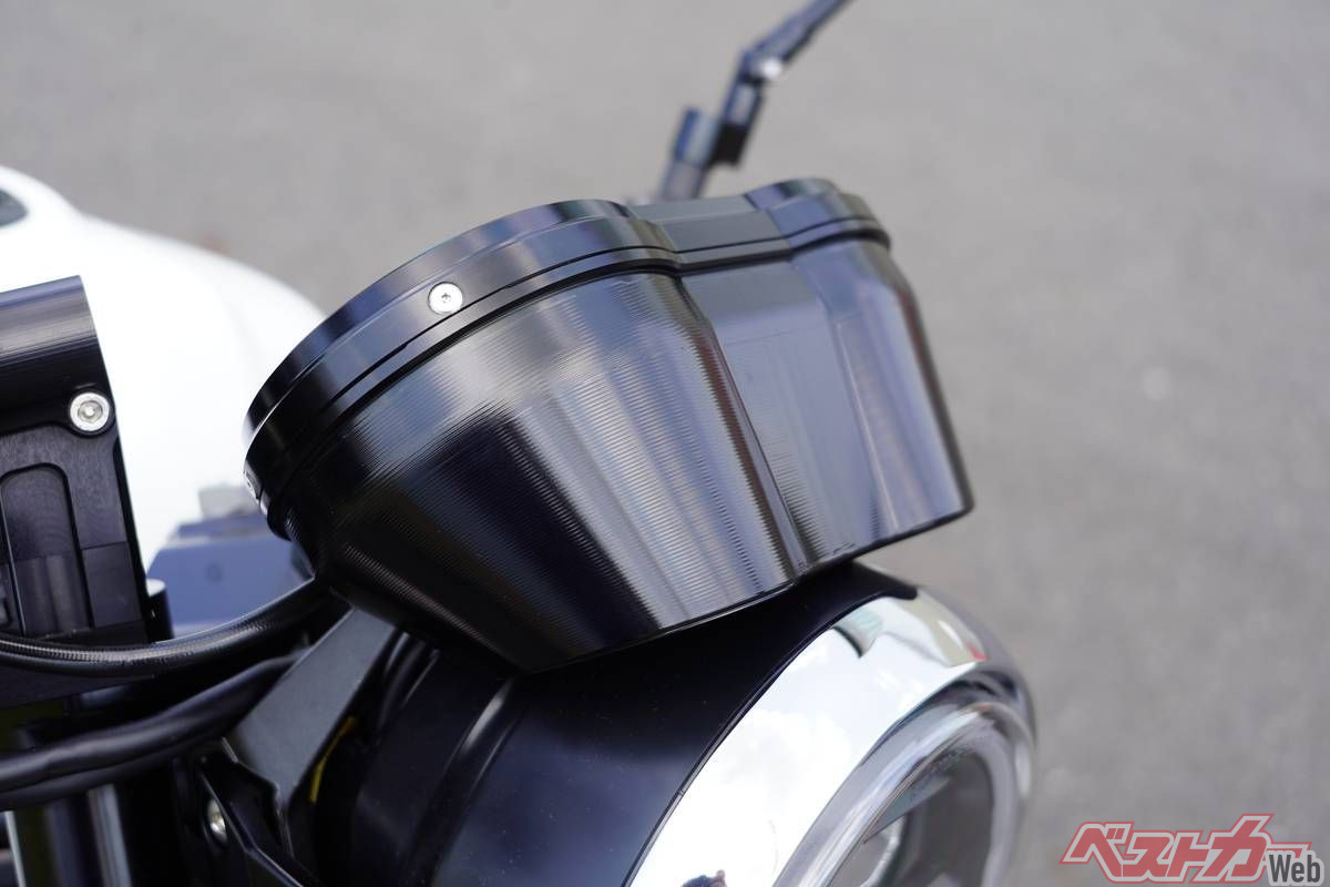 注目はそのコクピットまわり。なんとメーターには2連アナログメーターを思わせるカバーが追加。STDのスクエアTFTモニタはそのまま活用しつつ、クラシックな雰囲気が盛り上がる! ハンドルはSTDのバーハンドルから、トップブリッジごとレーシーなセパレートハンドルに変更。しかしポジションはアップライトで、これも往年のCB750Fをはじめとした時代を感じさせるスタイル。まさにコンセプト通りの仕上がりと言ってよいだろう。またカーボン製ミラーも装着済で、市販モデルへのイメージも膨らんでしまう。