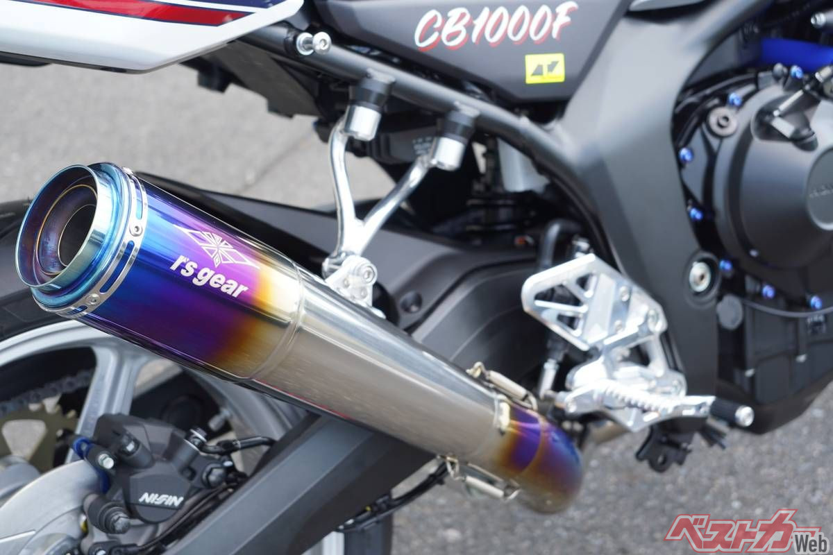 こちらもアールズギア製のフルエキには、チタンカラーのストレートサイレンサーが装着されている。