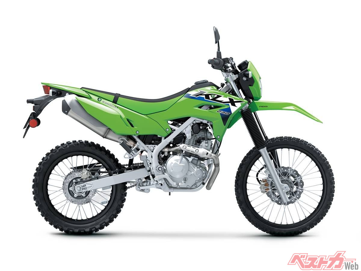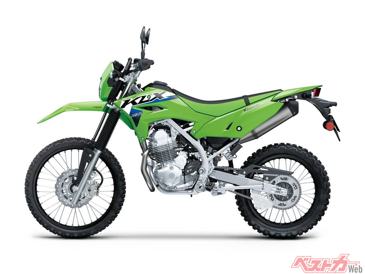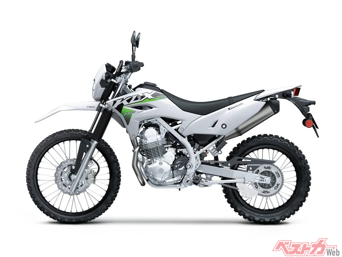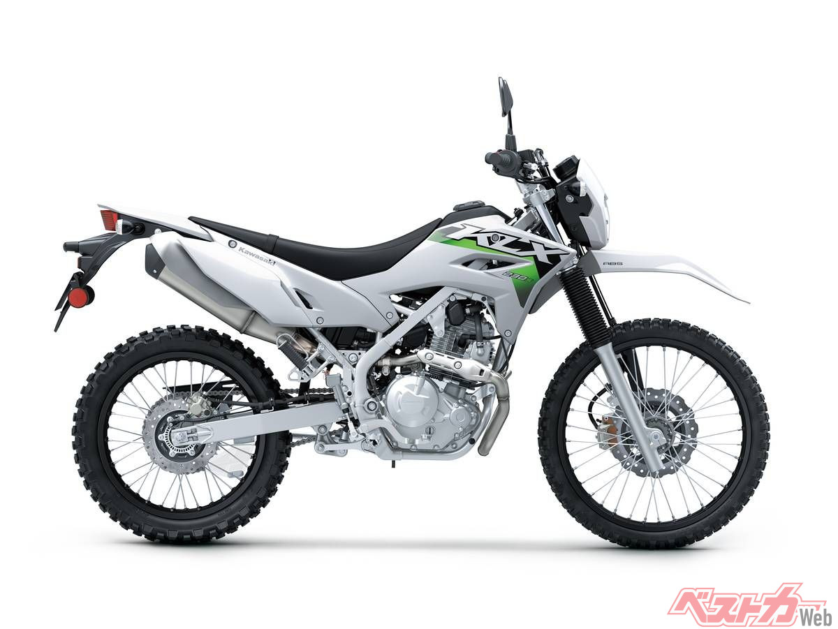 2020年からラインナップされていたKLX230は、いちど排ガス規制よって姿を消していたものの、昨年新エンジン&デザインで復活。令和2年排ガス規制に対応した空冷OHCシングルエンジンはボア×ストロークは基本設計こそ従来通りだが、吸気ポート形状やECUセッティングを見直し低中速域の出力特性を改善。最高出力は18PS/8000rpm、最大トルクは1.9kgf-m/6400rpmを発揮する。133kgの軽量なボディと相まって、軽快な取り回しと走破性を発揮する。外装もレーサーKX風のデザインに刷新された。「S」はSTDに対するローシート仕様で、スタンダードから35mm引き下げられた足つきのよいバリエーションだ。