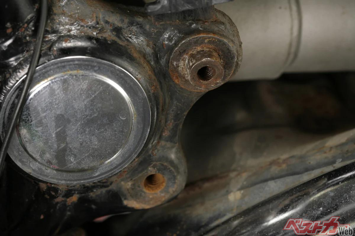 レギュレータ・レクチファイアのマウントは左ステップブラケットの裏側にあるが、ステップブラケットを取り外すと、マウント締結部のフレームは真っ赤にサビていた。このサビは間違いなく導通抵抗となってしまったはずだ。