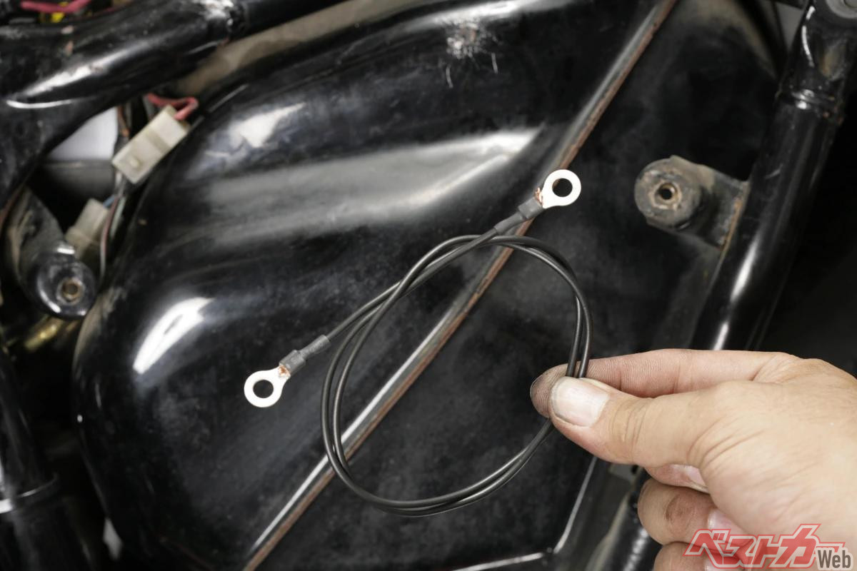 バッテリーのアース(-)端子とレギュレータ・レクチファイアボディをダイレクトに結線するアースィングコードを自作し接続してみた。効率良く電気が流れることで少しは充電量が回復したが、時すでに遅く、万全の充電状況は得られなかった。