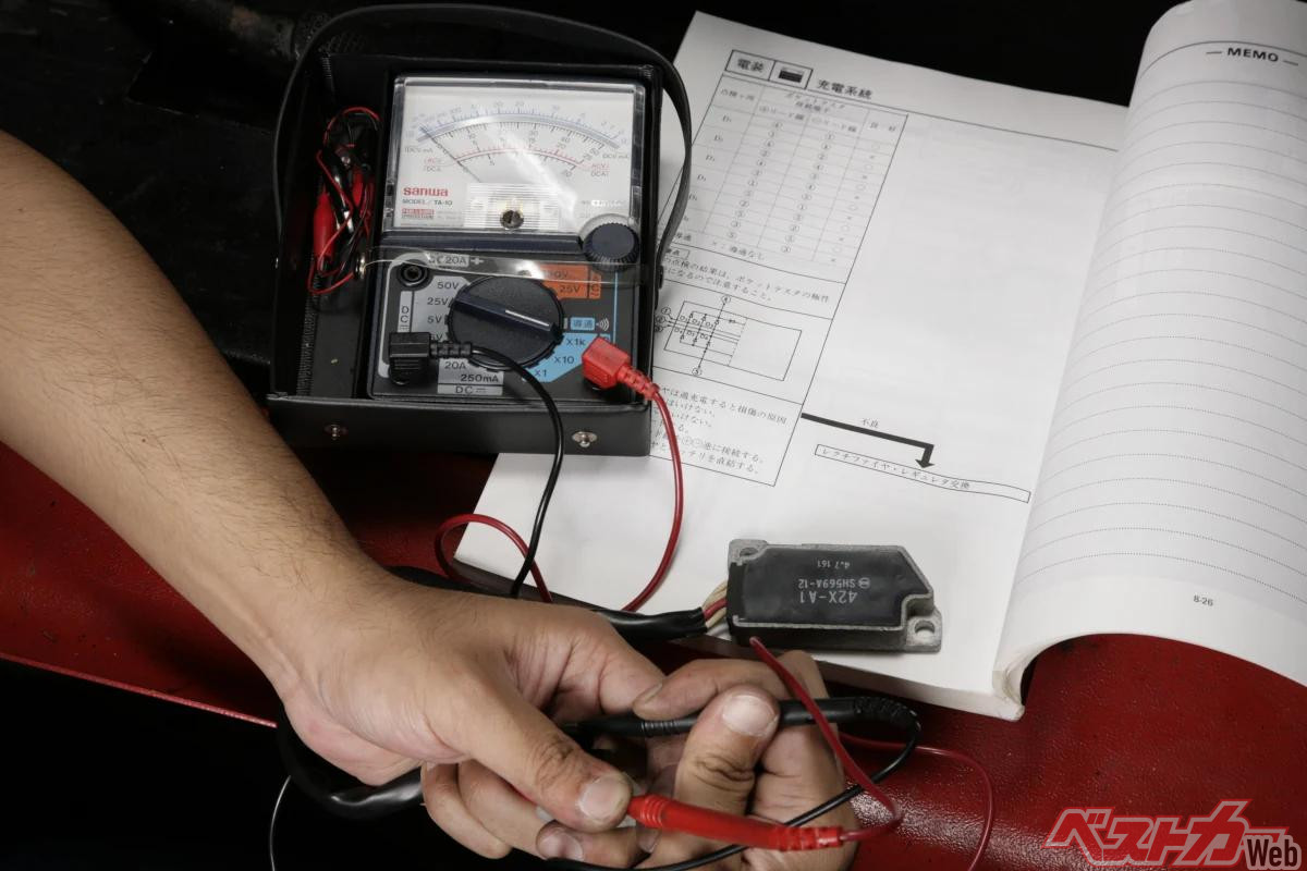 補充電済みバッテリーや新品バッテリーを搭載しても、しばらくするとエンジン始動時にセルモーターの回転力が低下し、エンジン始動不良に陥ってしまっていたヤマハV-MAX。以前にステーターコイルは新品部品へ交換していたようだが、亀裂が入っていたスターターワンウェイの修理後にエンジン始動しても、発電状況は今ひとつ良くなかった。満充電状況の12ボルトバッテリーの場合は、一般的に端子電圧は12.8ボルト前後で、V-MAXの場合は、エンジン回転2000rpmで14~15ボルトに達するとサービスマニュアルに記載されていた(バッテリーコンディションによって異なる)。