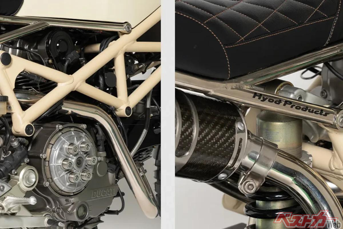 流石に“百の目”とまではいかないまでも、その独特な2眼ヘッドライトは異彩を放ち、ベース車両でもある「Monster」と呼ぶにふさわしい風貌。日本が誇るライディングギアブランド「HYOD」ということで、Dr.ソエダ氏のコレクション車両である「Monster S2R1000」と掛け合わせる際に、「モンスターというモデル名をリスペクトし、NARUTOが九尾を手なずけたようなイメージとHYODを重ね合わせて…」とコメントしている。