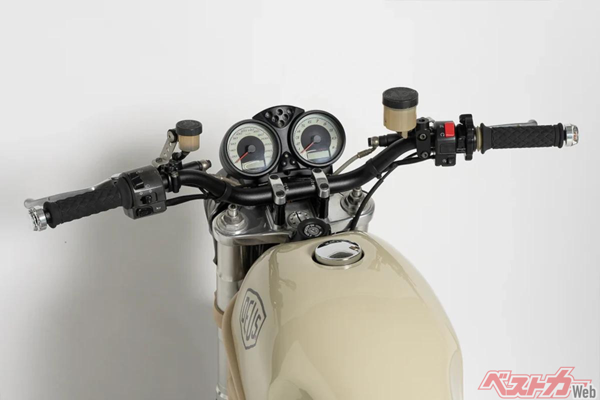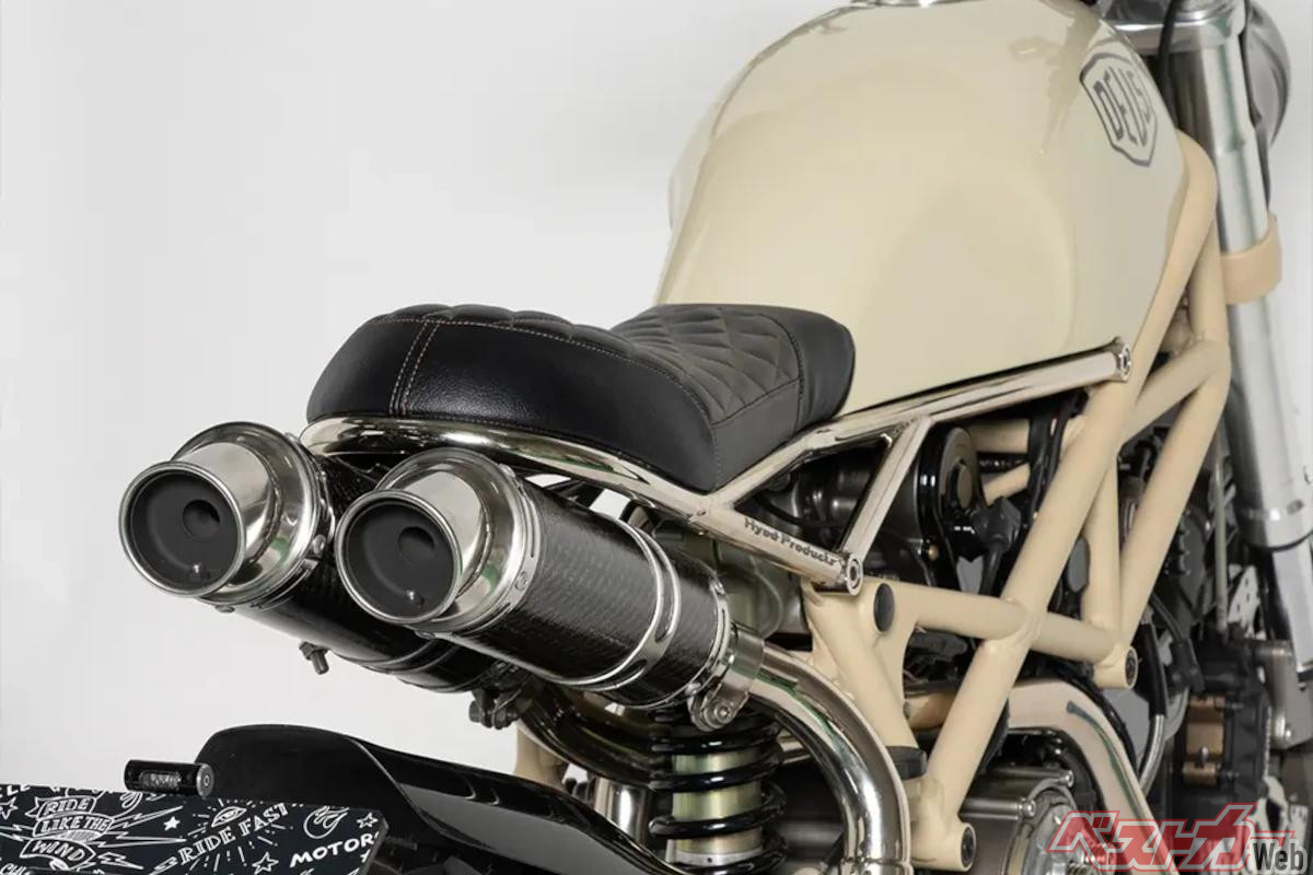 前後タイヤにはブロックタイプを採用し、サイレンサーをアップにすることで見事にスクランブラースタイルへと昇華。ただし2本のサイレンサーがセンターアップであることが独創性を感じさせる。その姿は、どこかアニメに登場するロボットや“化物”を連想させてくれるはずだ。