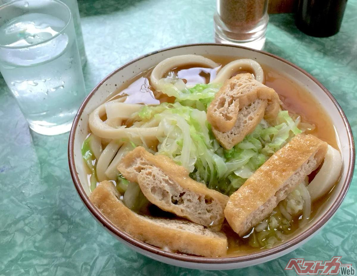 桜井うどんのメニューはシンプルに「冷たいの(つけ)」と「あったかいの(かけ)」の2種類のみで、トッピングもキャベツと油揚げのみの至ってシンプルな構成です!