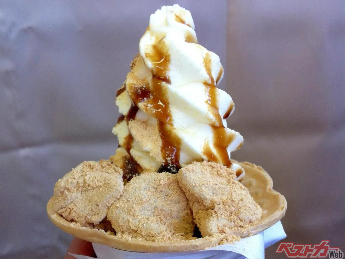 見た目そのままの「ソフトクリームに桔梗信玄餅を乗せてみた!」ってな感じのインパクト大のソフトクリームで、しかもしっかりと美味しいので(ここ重要です)ぜひとも桔梗屋でライダーの義務を果たしましょう。