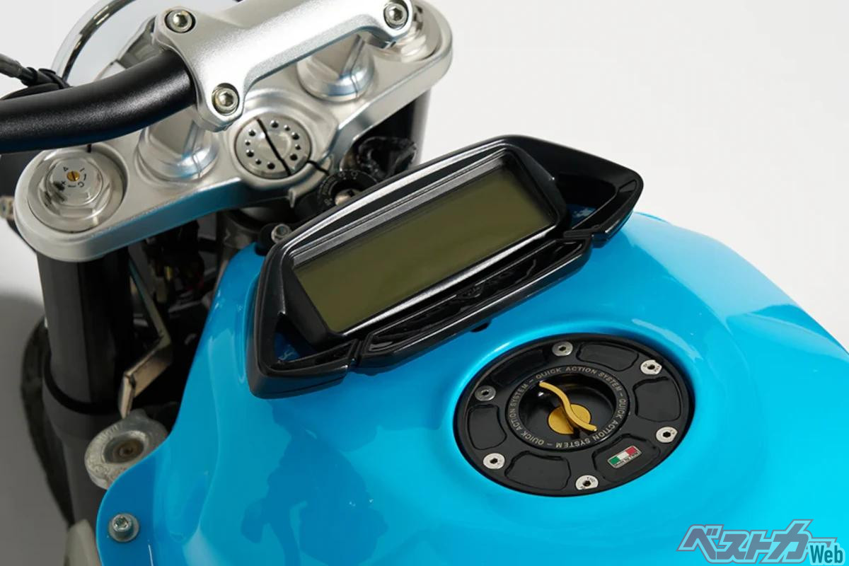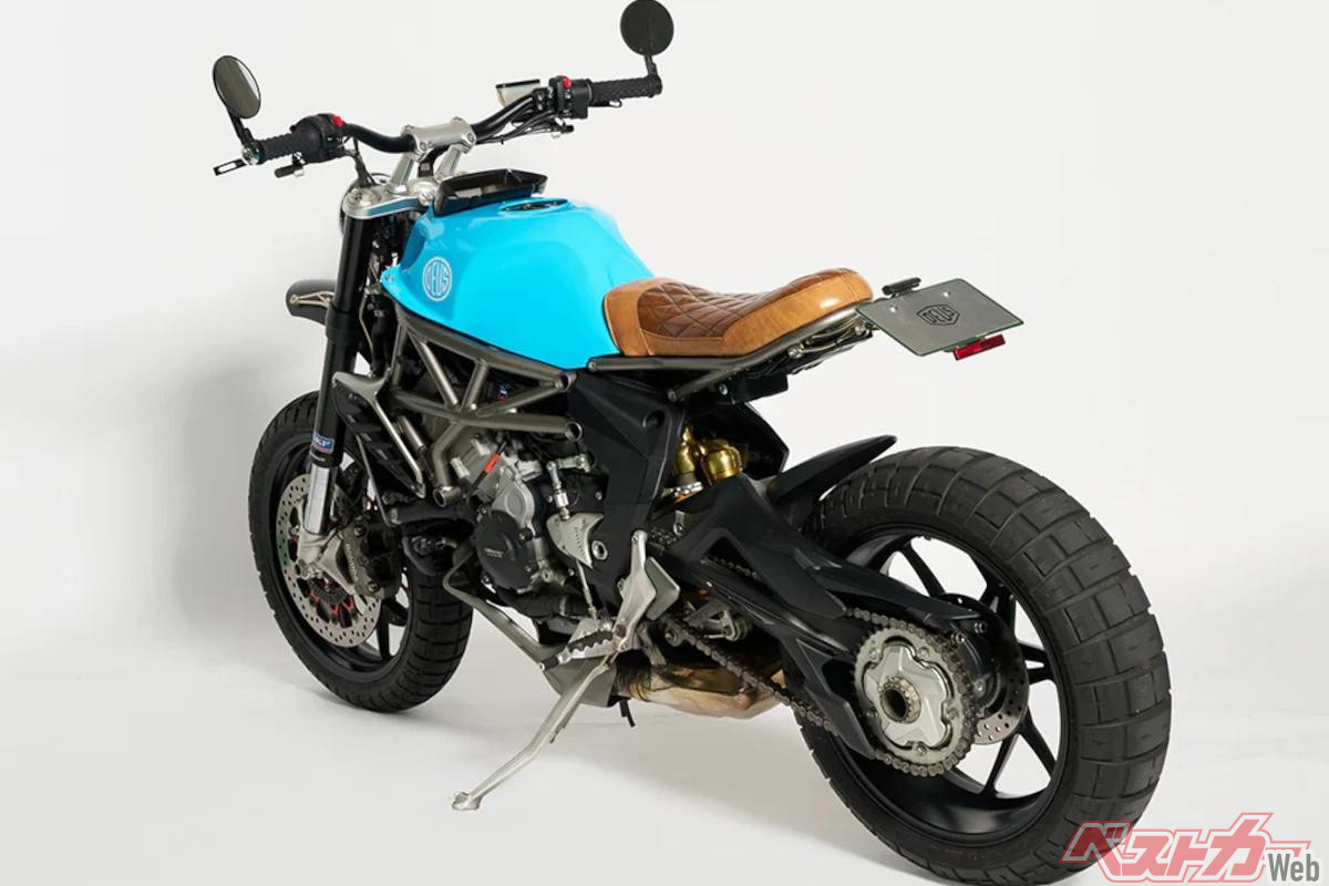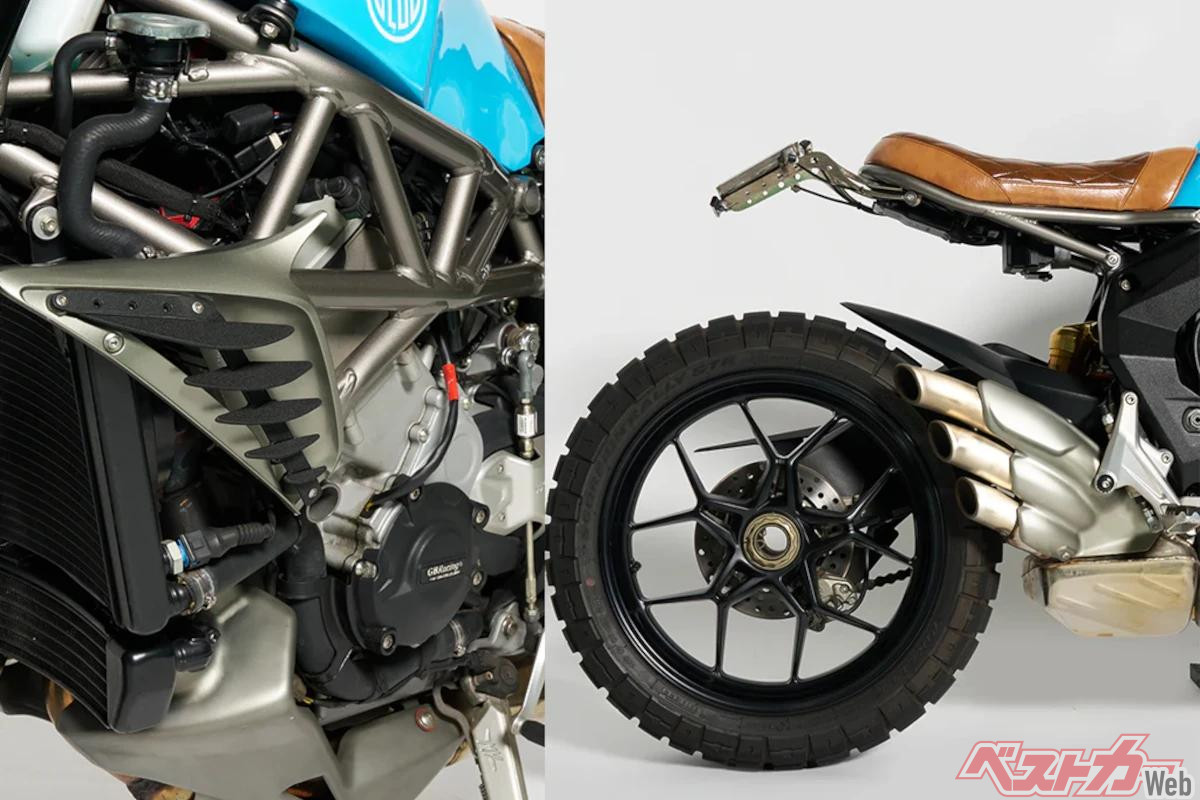 「リヴァーレ800」は2014年に市販が開始された798cc並列3気筒水冷エンジンを搭載する“スーパーモタード・スタイル”のスポーツモデル。そのモタード・スタイルから一気にスクランブラースタイルに変更され、よりコンパクトにまとめ上げられたのが「Blucita」である。