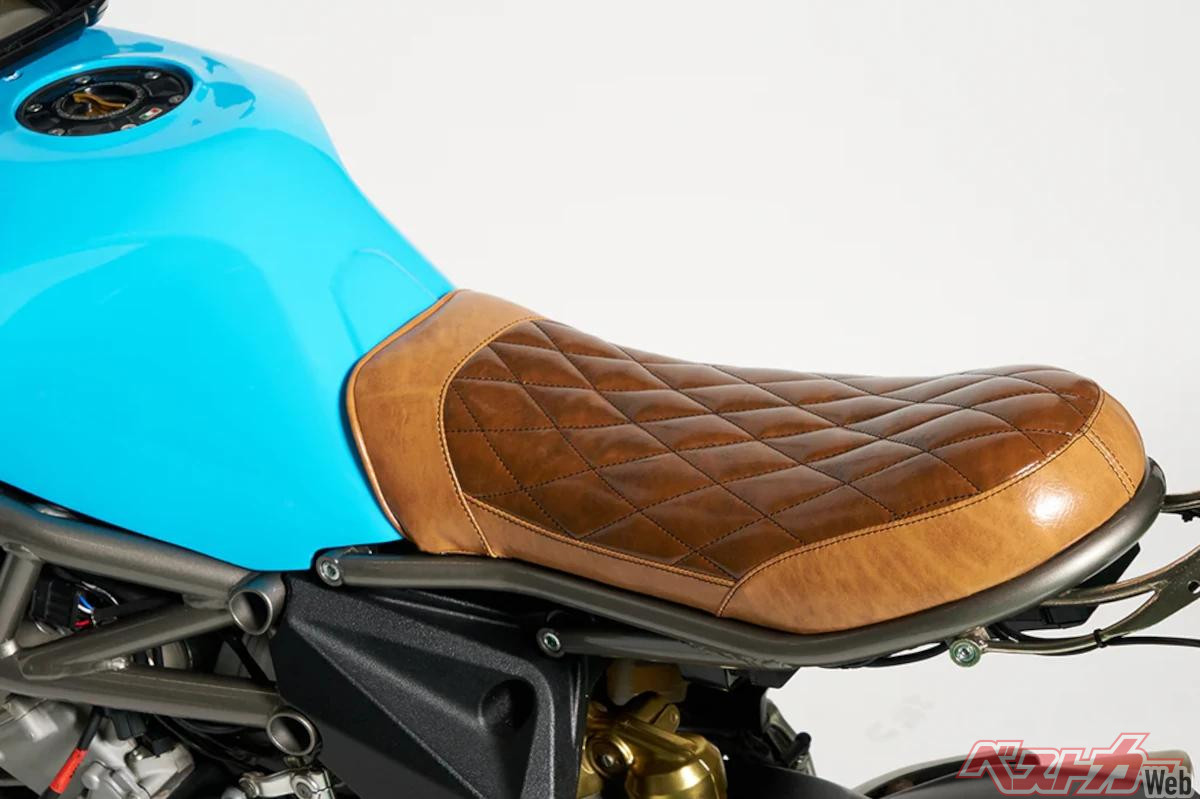 丸目のLEDヘッドライトやアップタイプのフロントフェンダー、さらにブロックタイヤを装備した外観は完全にスクランブラーだが、特徴的な3本のエキゾーストはオリジナルそのまま。特に目を引くのがその鮮やかなターコイズブルーに彩られたタンクと、クラシックで味わい深いキャメルブラウンのレザー製シートだ。