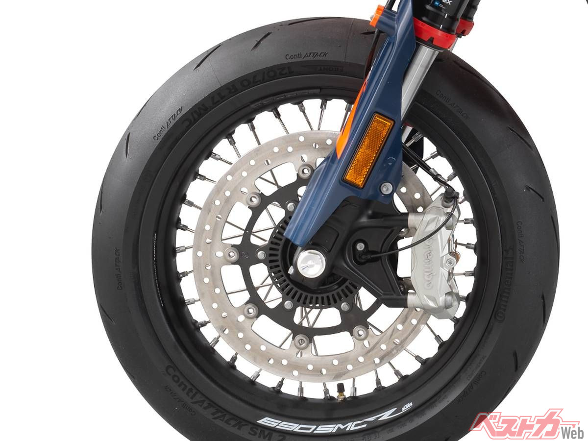 また、同時にスーパーモタード仕様となる690SMC Rも登場。前後17インチホイールにオンロードタイヤを装備するこちらも、改良点はエンデューロRに準じてパワーアップ。ローンチコントロールやアンチウィリーモードがパッケージされた「TRACK」モードも設定され、オンロードのアグレッシブな走行に最適化された。