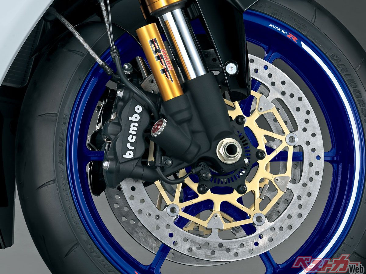 ブレンボ製モノブロックキャリパーを核とするブレーキ回りも変更はアナウンスされておらず、「Tドライブ」と呼ばれる、ブレンボ独特のフローティング機構を持つブレーキディスクも継続採用。これはインナー/アウターディスクの接触面積を増やすことで、マウントの数を減らして軽量化が可能というものだが、その反面ガタガタという音が出やすいため、GSX-R用では従来のピン式マウントを併用して発生を抑えている。