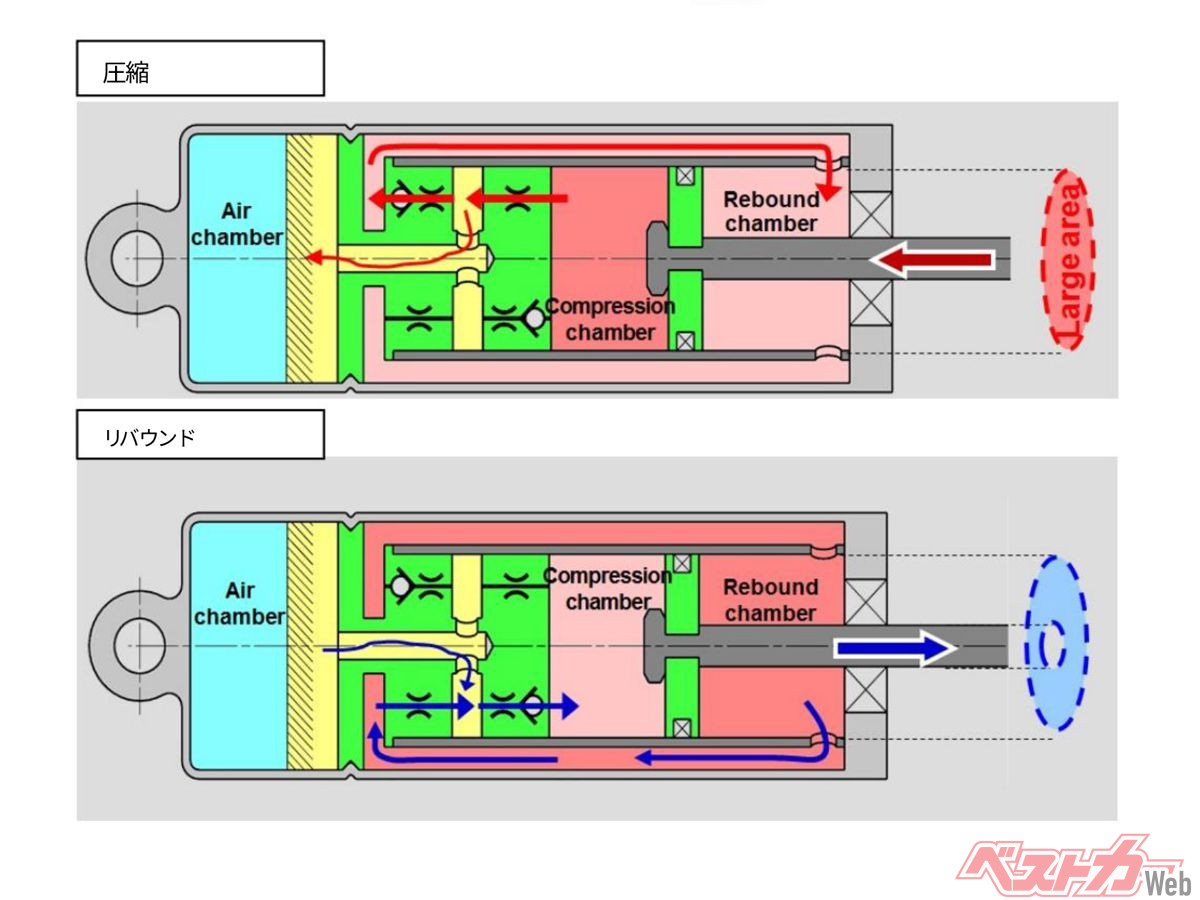 ダンパー内で生じる圧力差(ダンパーの作動性を阻害する)を機構的に解消したのがアステモのバランスフリー機構。GSX-R1000RではFフォークだけでなく、同じくアステモ製のリヤショック(BFRC-Lite)にも用いられる