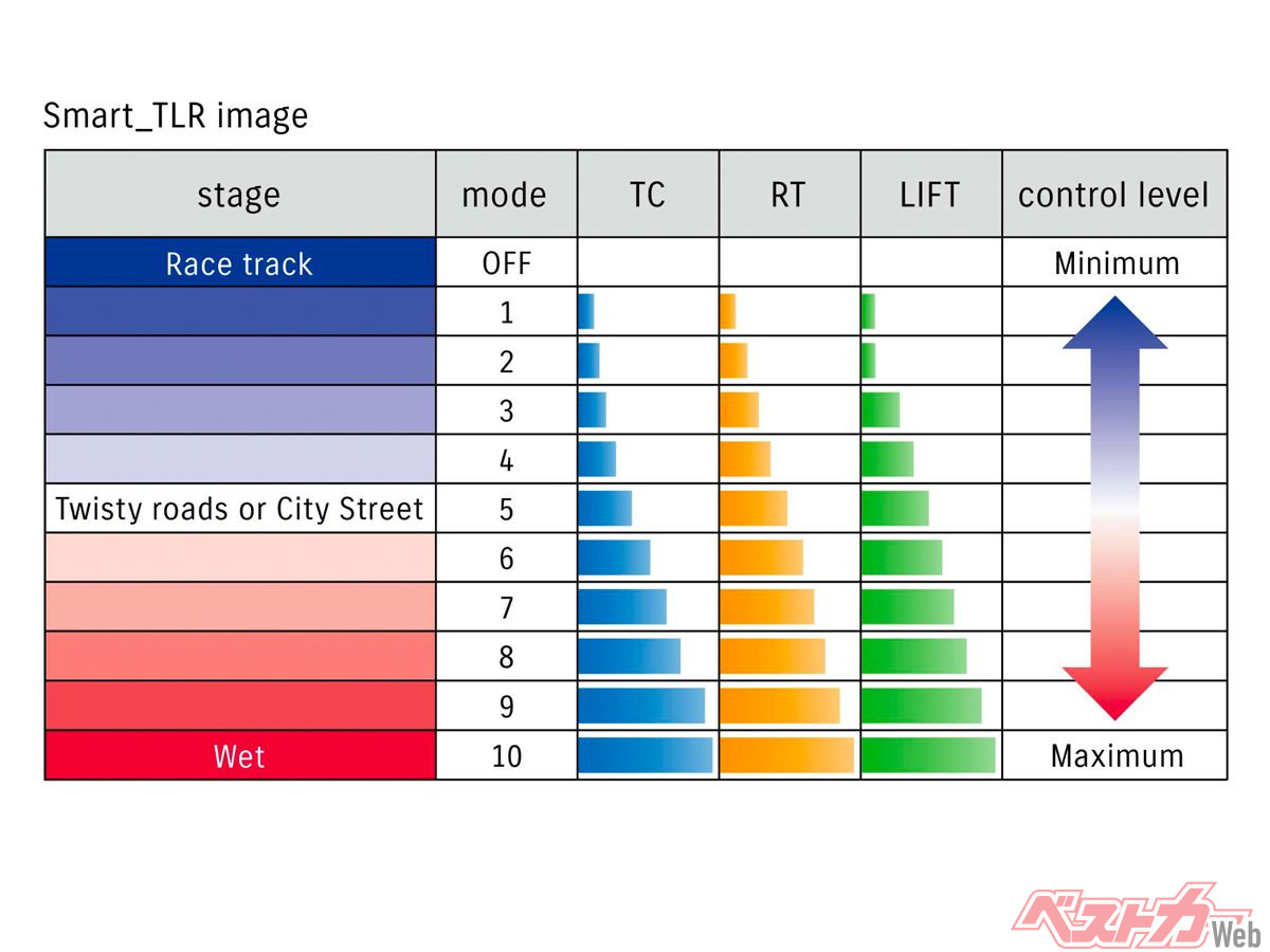 GSX-R1000/Rの新たな駆動力制御ロジック「スマートTLRコントロール」の概念図。TC(トラクションコントロール)、RT(ロールトルクコントロール)、LIFT(リフトリミッター)の3つを統合して制御するシステムだ。