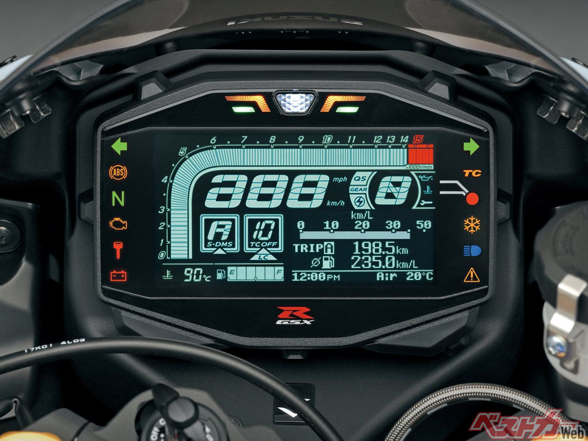 これはスズキ車でもっとも先進的な電制システムを持つGSX-S1000GXから投入された機能。つまり、新型GSX-R1000/Rの電制システムはスズキの最新版にアップデートされているというわけ。全ての電子制御システムを「スズキインテリジェントライドシステム(SIRS)」として総称することになったのもGX同様。メーターがモノクロ液晶のままで、GXと同じカラー液晶にならなかったのは残念だが…。