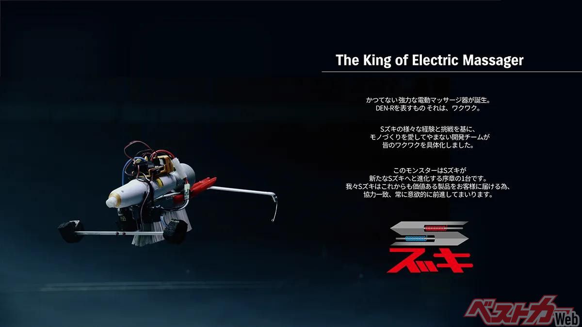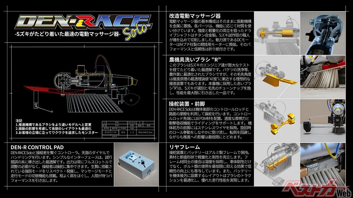 と、まあ新車紹介風に書いてみたのだが、このカタログに掲載されている「DEN-RACE Solo」はNHKの番組「魔改造の夜」で行なわれた「電動マッサージ器 25mドラッグレース」用にスズキ株式会社が開発したマシンである。この番組で「Sズキ」ことスズキはT橋技術科学大学、Mブチモーターと対決し、16秒13というタイムで優勝した。