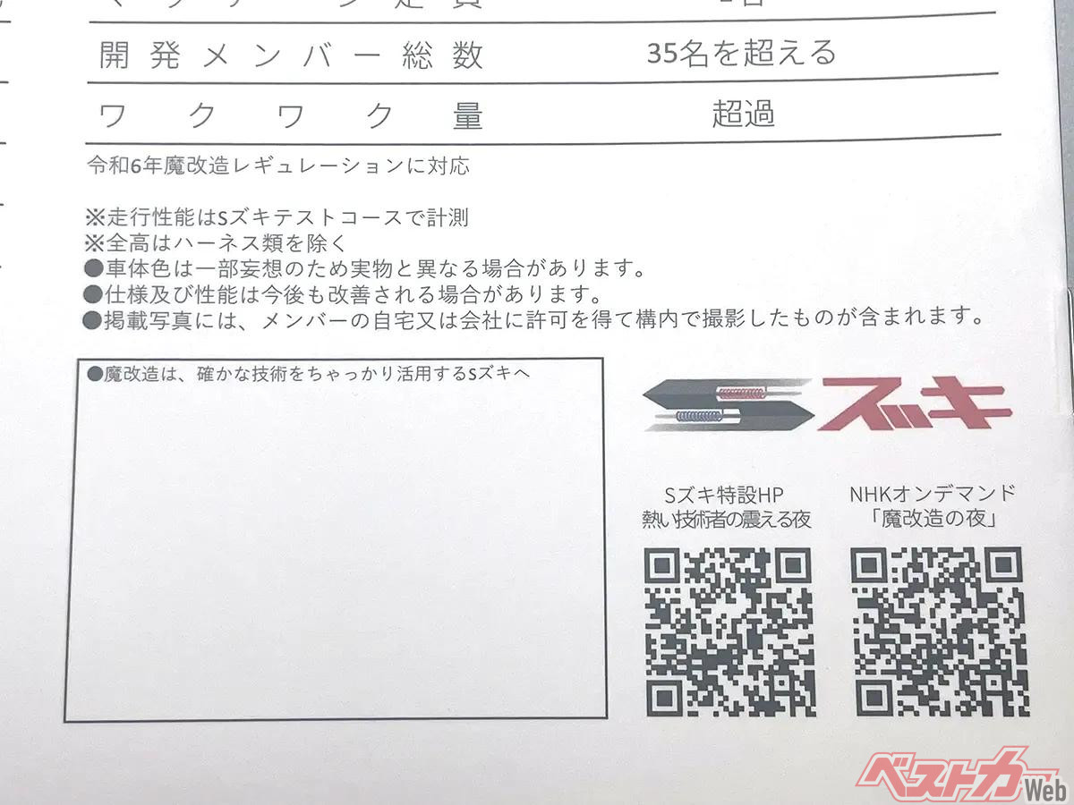 このカタログはスズキの特設サイト で公開されている「詳細解説」というPDFデータを元にしたものなのだが、実際の冊子にするに当たって細部を変更してよりカタログらしく仕上げられている。このカタログをデザインしたのは魔改造プロジェクトメンバーである山根氏と熊田氏であり、冊子するに当たって2ページ目の機体のイメージカットのバックには、山根氏の愛車であるGSX400Sカタナの写真が追加されている。