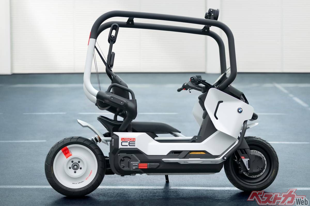 ガード装備でヘルメット不要! 新EV「ビジョンCE」コンセプトモデルをBMWが発表 往年の「C1 125」復活か!?【画像ギャラリー】