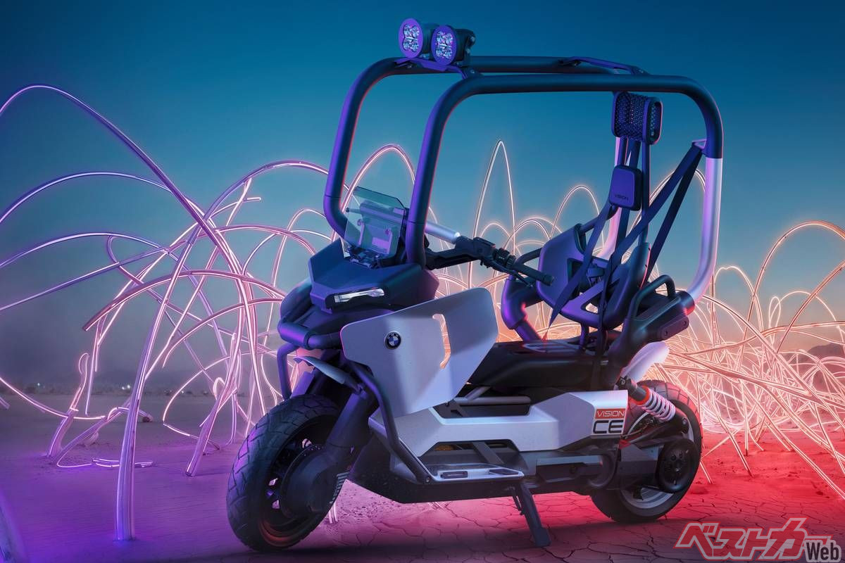 BMW Motorradが発表した「Vision CE」は、都市環境での新しい二輪移動を提案する電動ビジョンモデルだ。排出ガスゼロの電動ドライブを備えるだけでなく、最大の特徴はヘルメットや専用ウェアなしで走行できる安全設計にある。