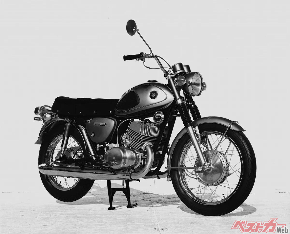 初代が1968年に登場し、ロードレーサー「TR500タイタン」のベースマシンにもなったのがT500。大きな特徴は、量産車として世界初の500cc・2サイクル2気筒エンジンを搭載したこと。耐久性に優れ、中低速重視のセッティングを施したこのエンジンは、最高出力47PS、最大トルク5.5kg-mを発揮。5段ミッションを介して最高速度181km/h、0-400m加速13.2秒という当時としては優れた走行性能を持つことで、世界の重量スポーツ車ファンから一躍注目を集めました。また、このエンジンを搭載したことで、T500は「2サイクルのスズキ」の名を確固たるものとした名車としても有名です。