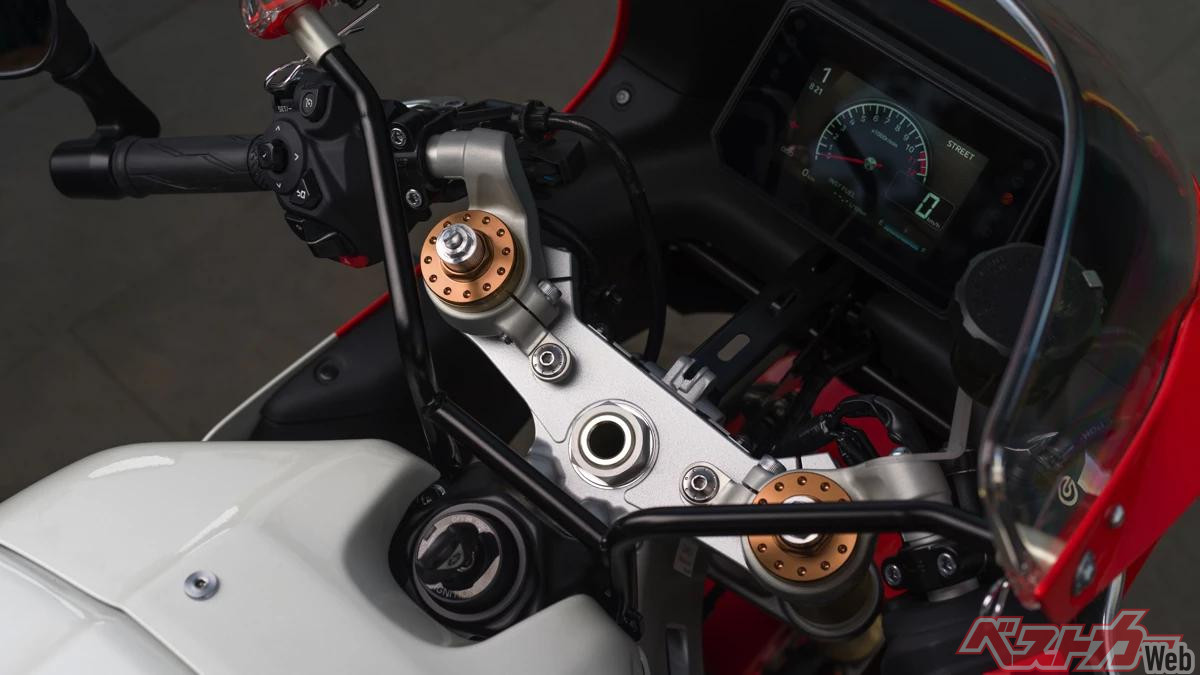 さらに、もともとのバーハンドルをセパレート式ハンドルに変更。ハンドルをマウントするトップブリッジ上面部分など、コックピットまわりのボルトも新デザインとし、質感の向上も図っています。