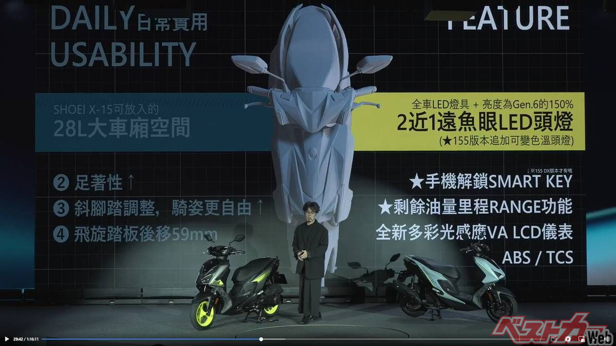現在のところ、発売情報は台湾向けのみのアナウンスがなされているが、日本でも人気のシグナスシリーズが世代交代を果たしたということは、もちろん日本導入も視野に入ると考えるのは自然だろう。その証左として挙げられるのは、発表会にて放送されたプロモーションムービーでは、台湾向けにも関わらず日本語でのナレーションが流れていたのだ! 本機の詳細なスペック、そして日本のヤマハからの続報など、今後も気になる新モデルの登場だ。