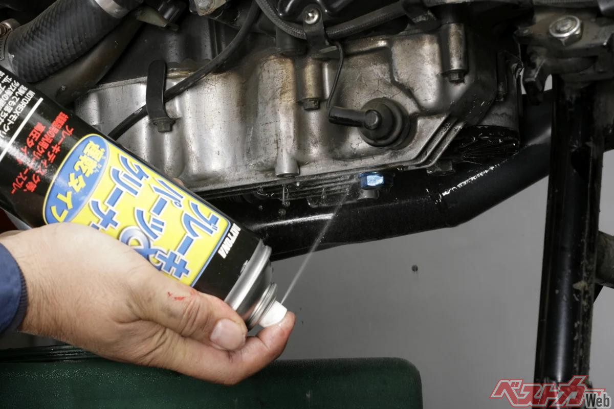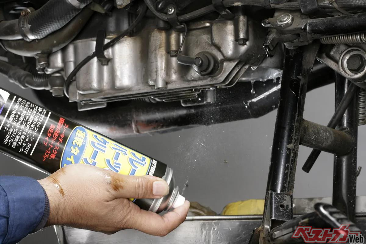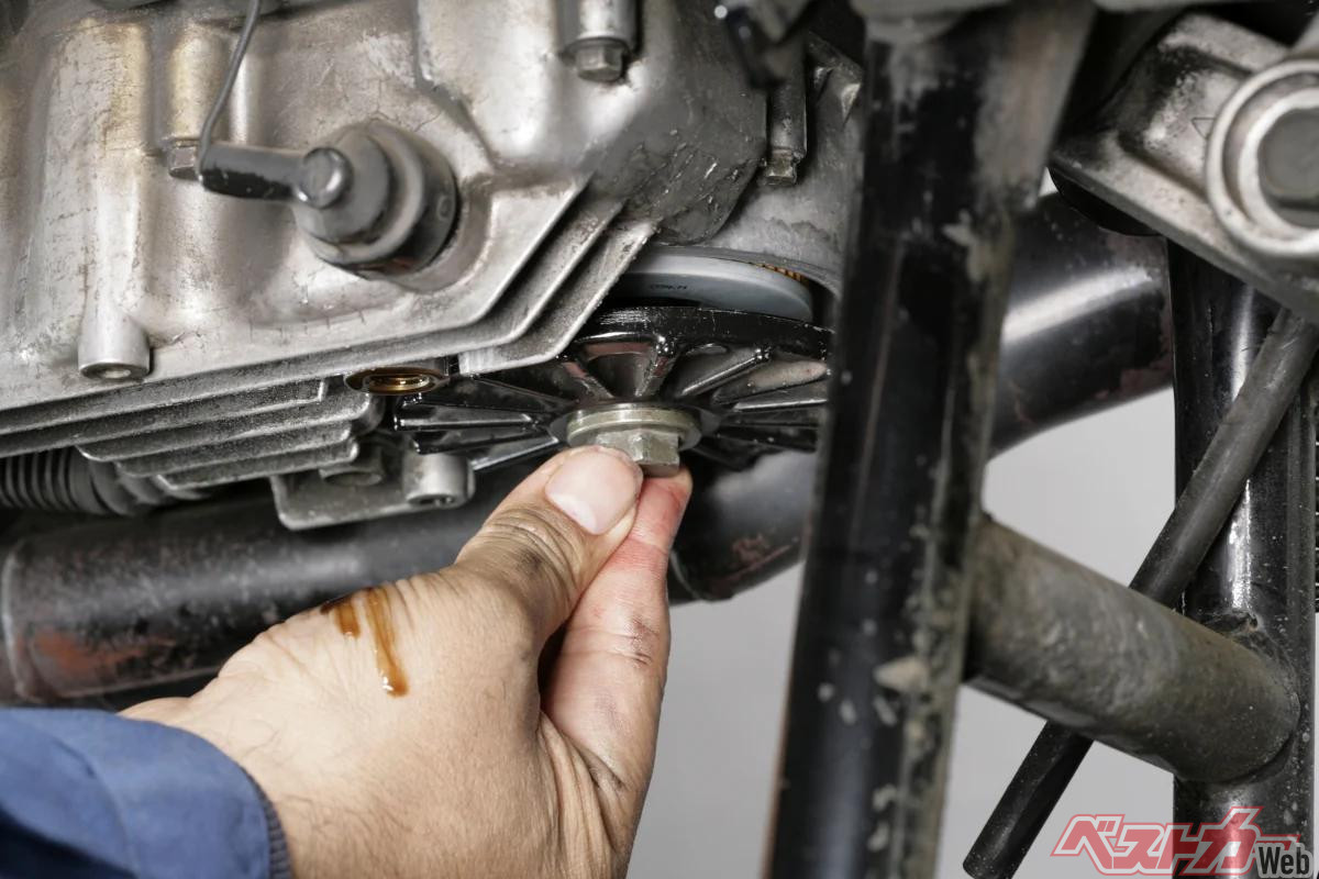 - ポイント2・エンジンオイル交換でドレンボルトを外した際に、流れ出たオイルがドレンパンに流れず車体に付着する場合がある