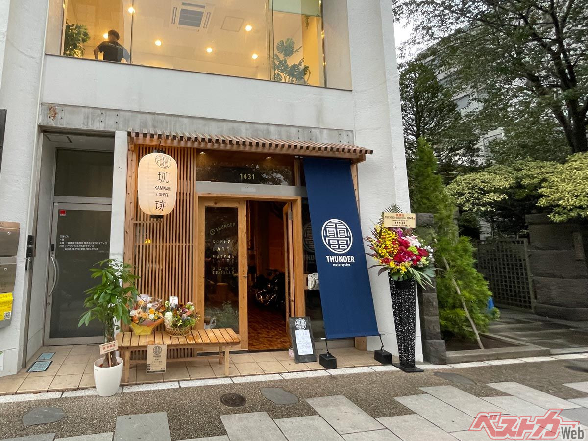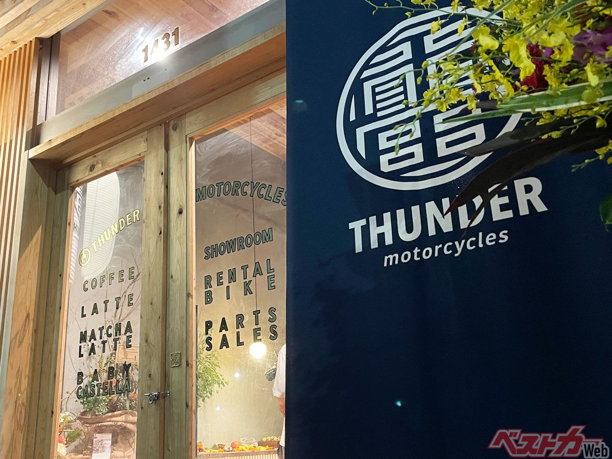 今回、浅草にほど近い東京都台東区にオープンしたのは、そんなサンダーモーターサイクルズの直営店となる「Thunder Motorcycles浅草店」。ショールーム&ディーラーとして車両展示や販売を行うのはもちろん、サンダー250のレンタルバイクも用意され、さらに喫茶店として「雷珈琲」など、ここでしか味わえないメニューも楽しめる。浅草らしい「和」を強調した店舗は確かにスタイリッシュなカフェの様相で、通行人からも注目を集めていた。