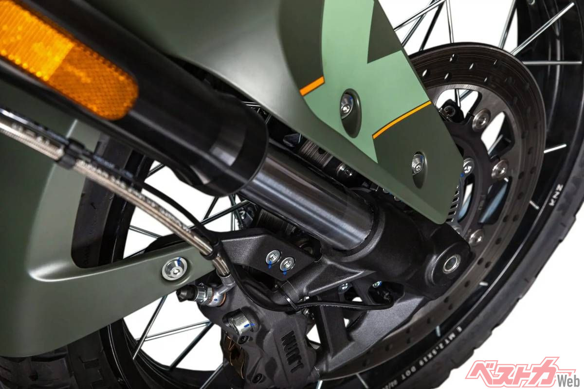 フロント19インチ、リア17インチのホイールにはピレリ・スコーピオン・ラリーSTRを採用。オン・オフを問わず高い走破性を発揮する。前後サスペンションはKYB製で調整機構付き。ブレーキはJ.Juan製ディスクとBOSCH製2チャンネルABSを組み合わせ、確かな制動力を備えている。