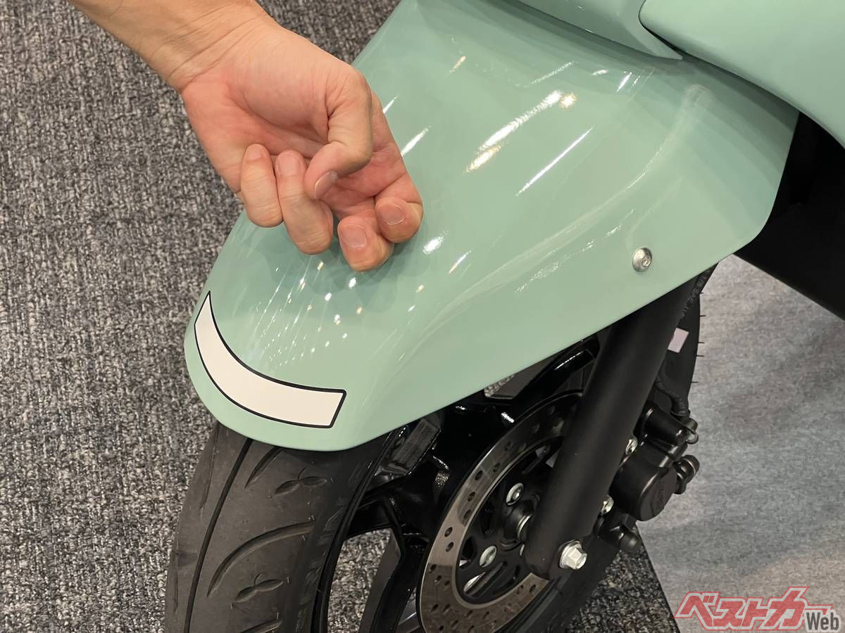 外装にスチール製パーツが多かったアドレス125だが、新型ではFフェンダー、レッグシールドの一部以外は樹脂製に置き換わった。