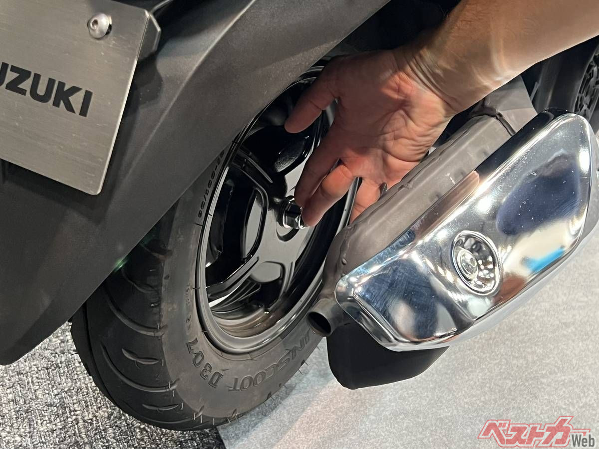 マフラーのデザインも変わったが、タイヤ交換がしやすい工夫のホイールとのスペースは従来通り。