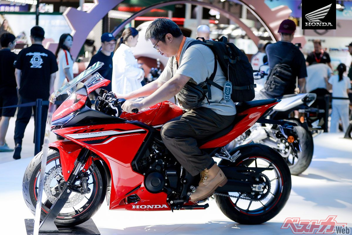 CB500スーパーフォアとともに中国・重慶ショーで世界初公開されたホンダCBR500R FOUR。フルカウルの車体に502ccの直列4気筒を搭載したミドルスポーツモデルだ。日本向けには400cc版の登場が確実と思われるが、そのお披露目にはもう少し掛かりそう…というわけで、その前に気になる足つき性とライポジを中国直送の撮り下ろしカットでご紹介。フルカウルモデルとしては快適性も兼ね備えているようだ。