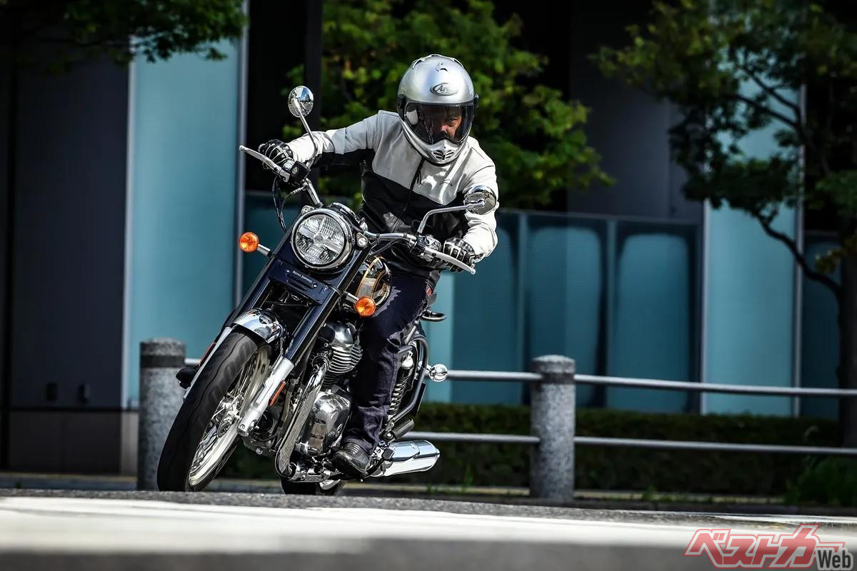 この中で、僕が一番しっくりくるのがクラシック650だった。市街地の低速域でも軽快感があるのは後輪が大きいからで、直立付近から前輪のステアするフィーリングがとても良い。峠では、ショットガンほどクイックではないものの、ライダーを急かさない穏やかさがあり、僕の感性にすっと馴染んでいく。本物の英国クラシックバイクは、もっと軽く華奢で重厚感はないもの、このライダーに馴染む感覚がどこかクラシックバイクらしさを感じさせるのだ。