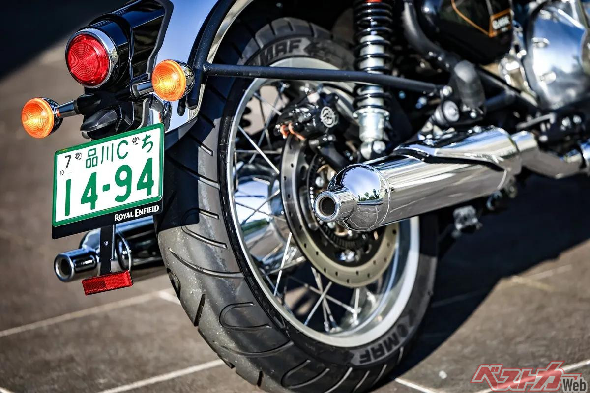 クラシック650は、すでに登場しているスーパーメテオ650とショットガン650と同系列のエンジンとフレームを採用したバイク。この車体はコンチネンタルGT650やベア650のダブルクレードルフレームよりも、エンジンを低く搭載できるのが特徴だ。もちろんサスペンションなどは3車とも異なるが、車両のキャラクターを決定づけているのはホイールサイズにある。
