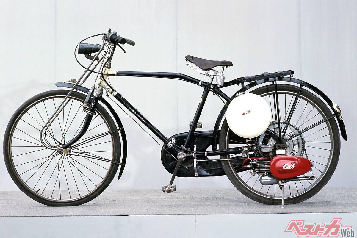 バイクをはじめとして、自動車や発動機、航空機までを手掛ける総合モビリティーメーカーであるホンダだが、その名を全国に知らしめた製品が自転車を改造できるエンジンキット「カブf型」だったことは有名だ。1952年に発売されたこのキットは、エンジンと燃料タンク、操作系パーツを普通の自転車に取り付けるだけで、バイクのように軽快に走ることができるもの。小さなマフラーは特徴的な排気音から「バタバタ」とも呼ばれ、完成品のバイクよりも安く、簡単に扱えたことから爆発的ヒットを生んだ。本機の流行が、のちの国民的バイク「スーパーカブ」にもつながっている。