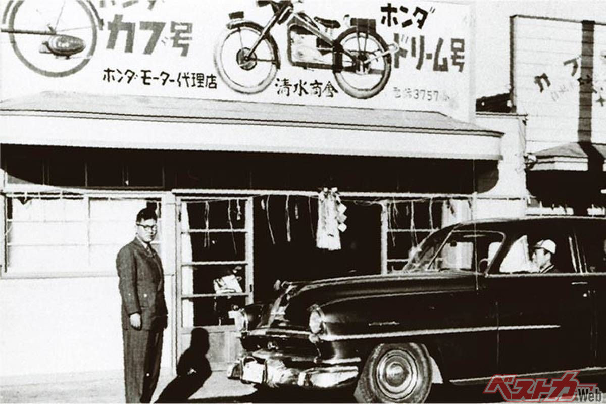 このカブf型がヒットした理由はもう一つあり、それが「自転車店での販売を行った」ことだと言われている。通常、バイクならバイクショップで販売するのが当たり前だが、ペダル付きバイク、いわゆるモペッドにあたるカブf型は、一般ユーザーにとってバイクショップよりも身近で数が多い自転車店の方に親和性が高く、気軽に購入できたというわけだ。