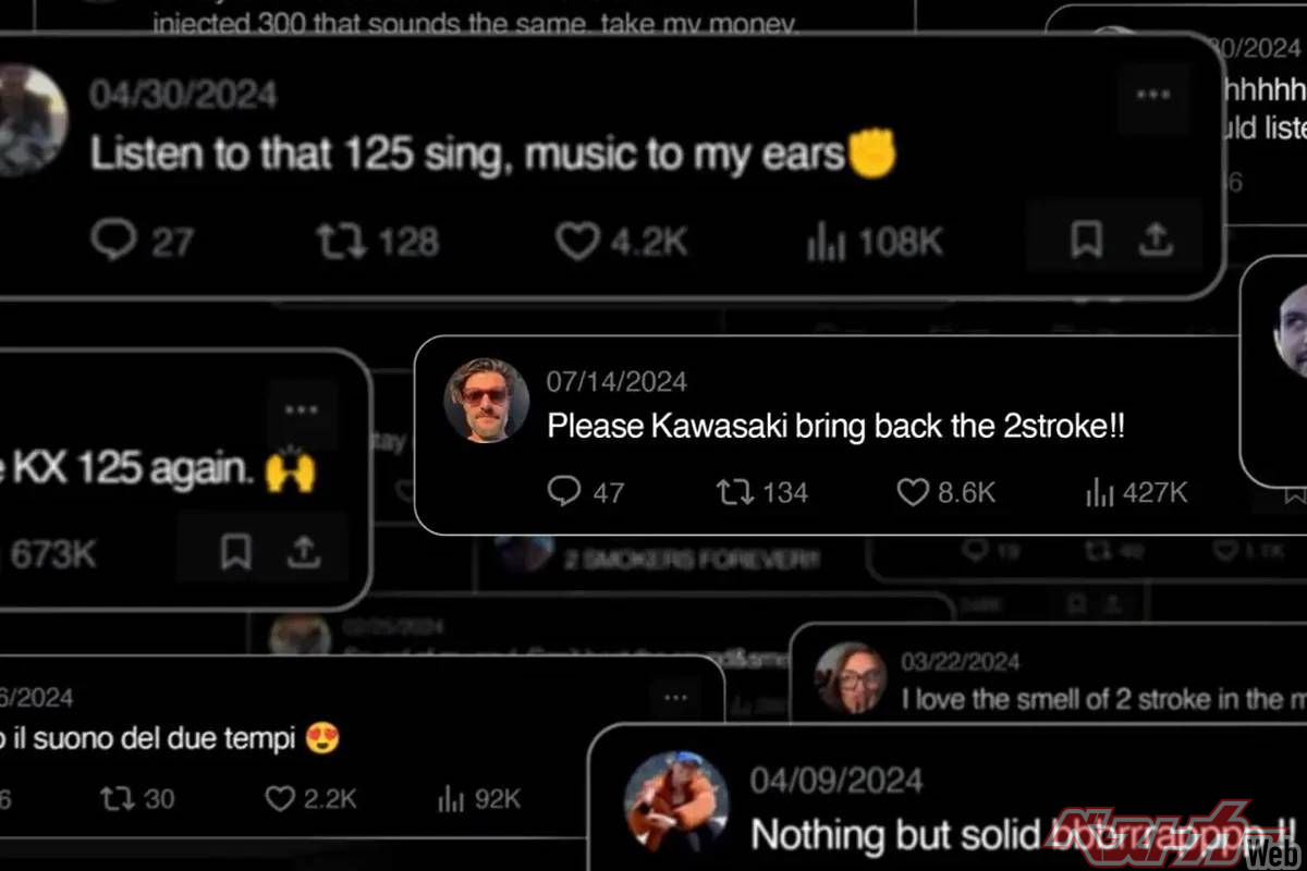 では「世界初公開」のもう1台はなんだろうか。ここで思い出したいのは今年1月、北米カワサキが発表したティザームービー。そこではなんと「2ストエンジン」搭載の新モデルがハッキリと示唆されていたのだ。カワサキが2ストモデルを秘密裏に開発中である……という噂は数年前から囁かれていたが、実際にカワサキは2024年7月、インジェクションによる直噴「過給機付き2ストエンジン」の特許を取得していることが明らかとなっており、実際に車体に搭載されるのはほぼ間違いない状況となっていた。