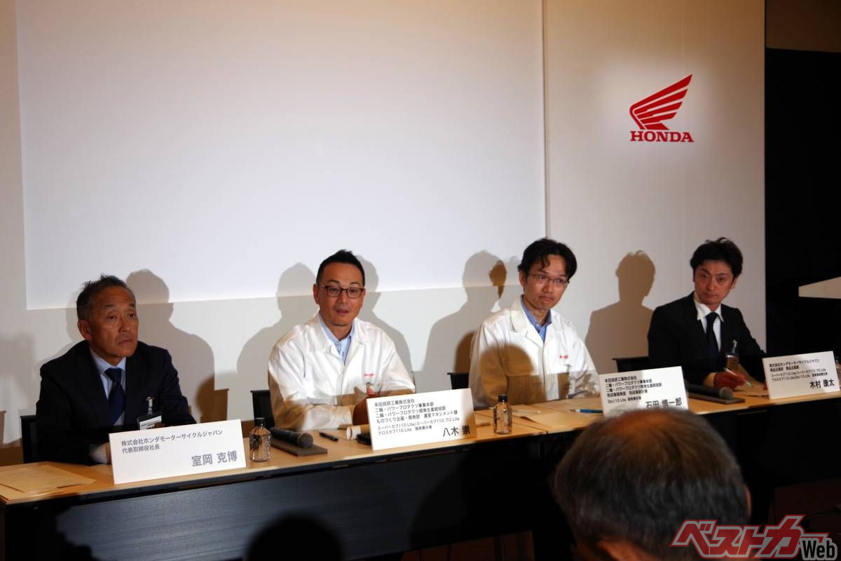そこで新たに、原付二種クラスのモデルに出力制限を加えて、原付免許で運転できるようにする新制度が今年4月に施行開始。50ccモデルに代わる新たな選択肢が許可された。これに対応した「新基準原付」の初めてのモデルが、今回ホンダが発表した「ディオ110 ライト」「スーパーカブ110 ライト」「スーパーカブ110プロ ライト」「クロスカブ110 ライト」の4モデルだ。これらについてホンダモーターサイクルジャパン代表取締役・室岡克博氏をはじめとした、開発・販売チームの4名が登壇するメディア向け新基準原付の発表会も執り行われ、多くの報道関係者が集まった。