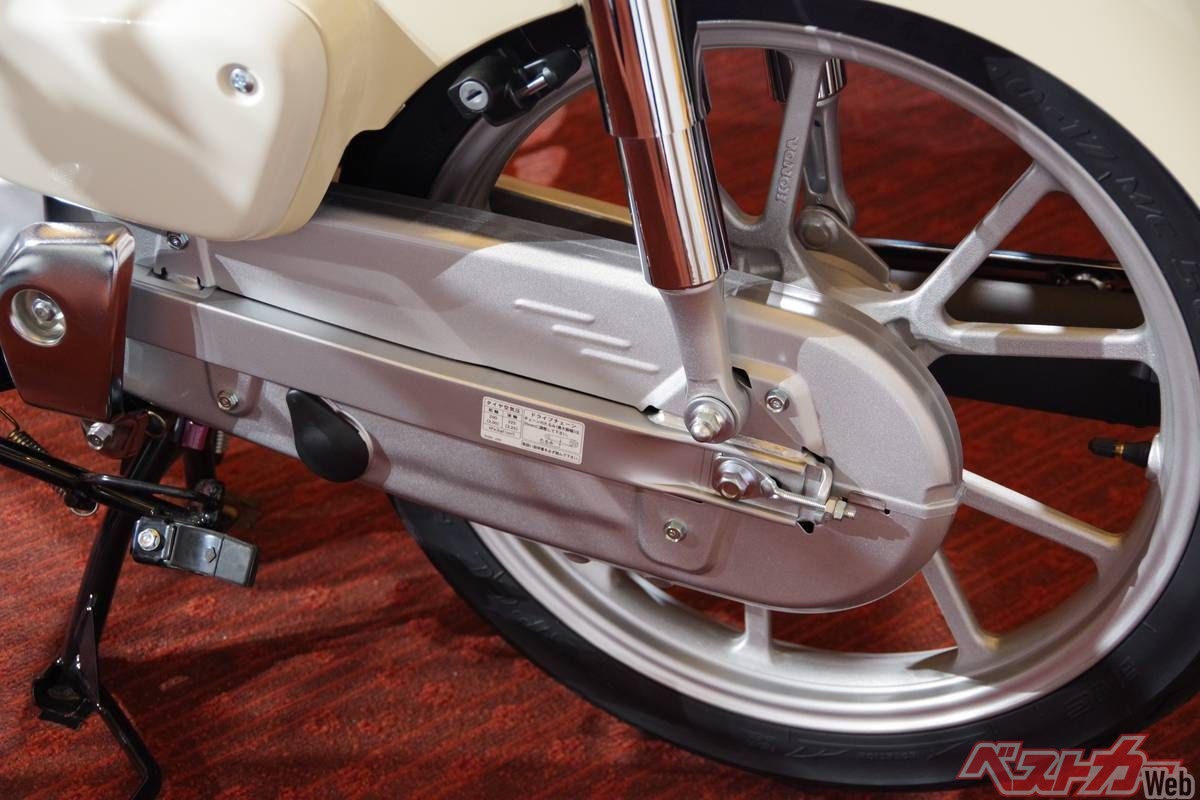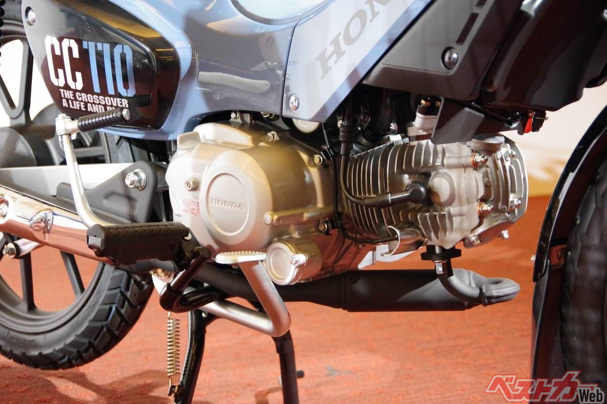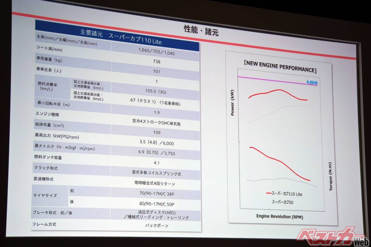 しかし走行フィーリングは従来の50ccモデルとは大きく異なるという。その理由は排気量を維持したままのエンジンにある。スーパーカブ110ライトの場合、最高出力は3.5kW(4.8PS)/6000rpmで、従来のスーパーカブ50の2.7kW(3.7PS)から1.1PSアップ。スーパーカブ110の5.9kW(8.0PS)よりは下がっているが、50ccよりも出力は向上している。さらにトルクは6.9Nm(0.8kgf・m)/3750rpmで、50ccの3.8Nm(0.39kgf・m)/5500rpmから2倍になった。最高速度にはリミッターが装着されるが、加速や傾斜でのパワーは50ccよりも大幅にアップしているというわけだ。