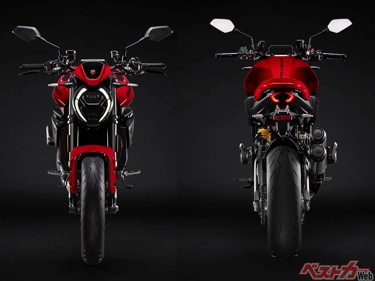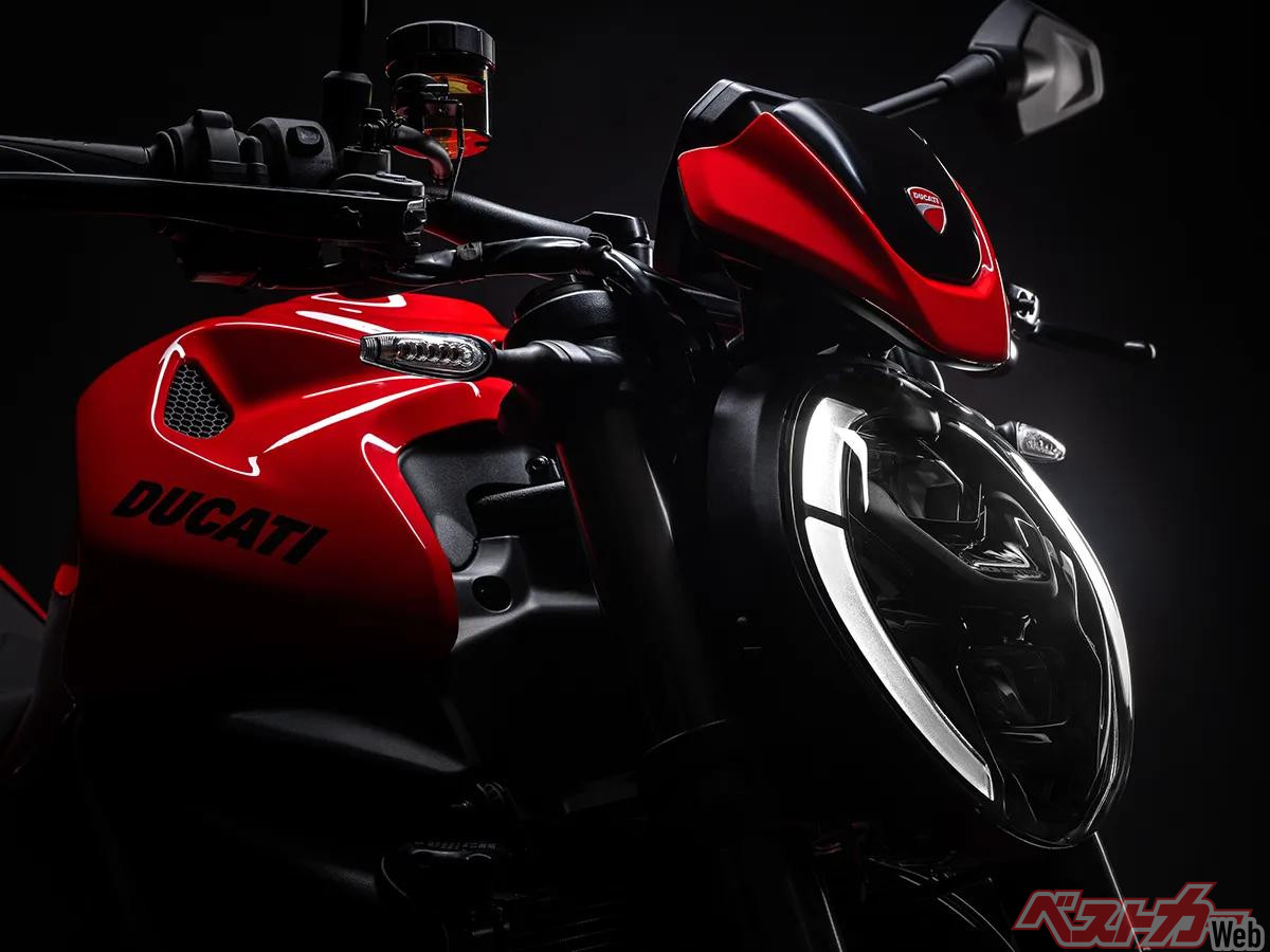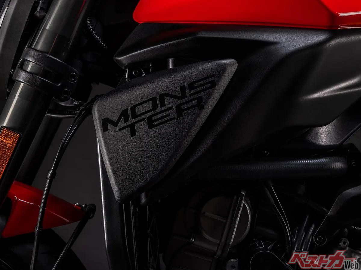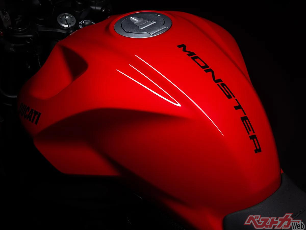 バイクデザインにおいて真の顔となるヘッドライトはモダンなデザインのフルLEDタイプを採用。フロントエンドを短く、燃料タンクの肩の間に「凹んだ」ように配置するために、非常にコンパクトになっている。フューエルタンクは、モンスターの最も特徴的なデザイン要素であり、極めて現代的なビジュアルと、フロントのエアインテークなど過去の象徴的なモデルへのオマージュを融合させている。エアインテークは、タンク内の冷却とステアリングアングルの拡大という2つの機能を果たし、モンスターのフューエルタンクを特徴づける彫刻的で力強い外観を生み出している。