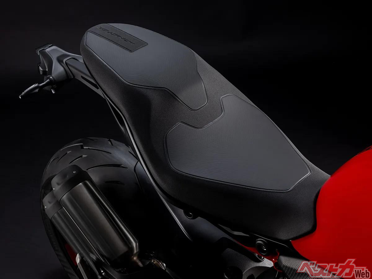 テールのデザインは、フューエルタンクとともにモンスターのデザインアイコンのひとつであるシートとトレリス構造のサブフレームが特徴的だ。シート高は815mmと従来モデルよりも低く設定され、ローシートとローダウンサスペンションを組み合わせることで775mmまで下げることができる。また、幅が狭くデザインされたシートが、足つき性の向上に寄与している。ハンドルバーはより高く前方に配置されたことで、スポーティなライディングにおけるコントロール感が向上するとともに、よりリラックスしたライディングポジションを実現している。