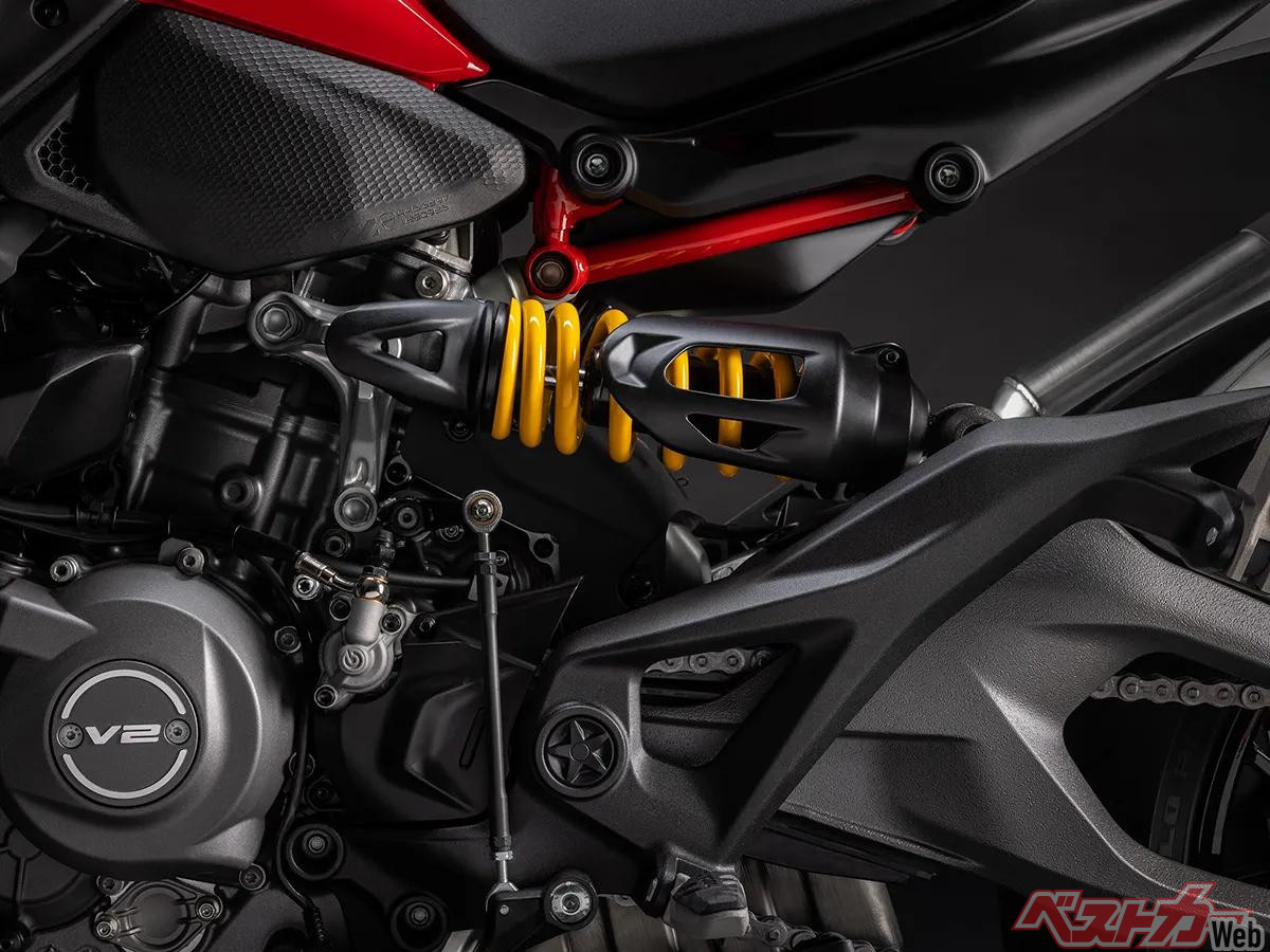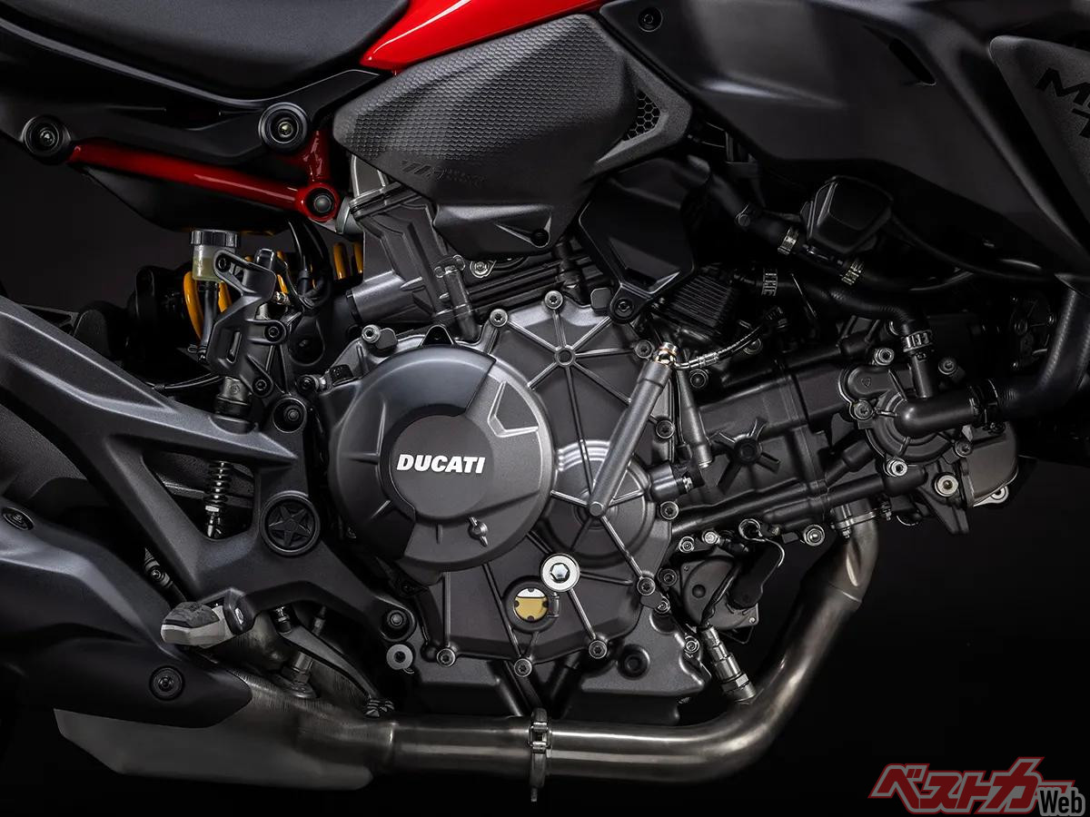 搭載されるV2エンジンは、IVT(インテーク可変タイミングシステム)搭載により軽量(※前モデルのテスタストレッタ・エボルツィオーネより5.9kg軽量)かつ高性能を実現。さらに、バルブクリアランス点検のためのメンテナンス間隔は4万5000kmであり、非常に低いランニングコストも特徴となっている。先代までが搭載していたベルト駆動のデスモドロミックエンジンはドゥカティの象徴でもあったが、メンテナンス面でのコストはネックとなっていた。そのメンテナンスフィーの不安から解放されたV2エンジンの搭載は、より多くのドゥカティユーザーを産む起爆剤となるだろう。