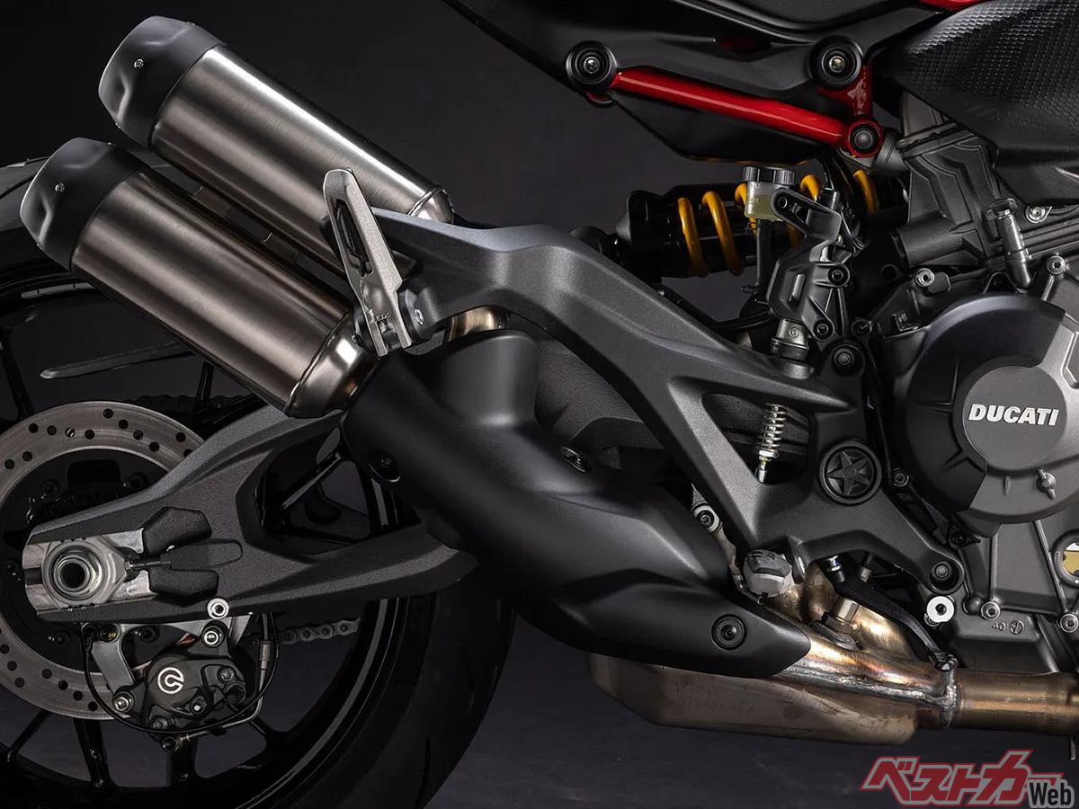 右に出されたデュアルエキゾーストが力強さを感じさせるリアビュー。コンパクトにまとめられたテール周りもモンスターの伝統だ。