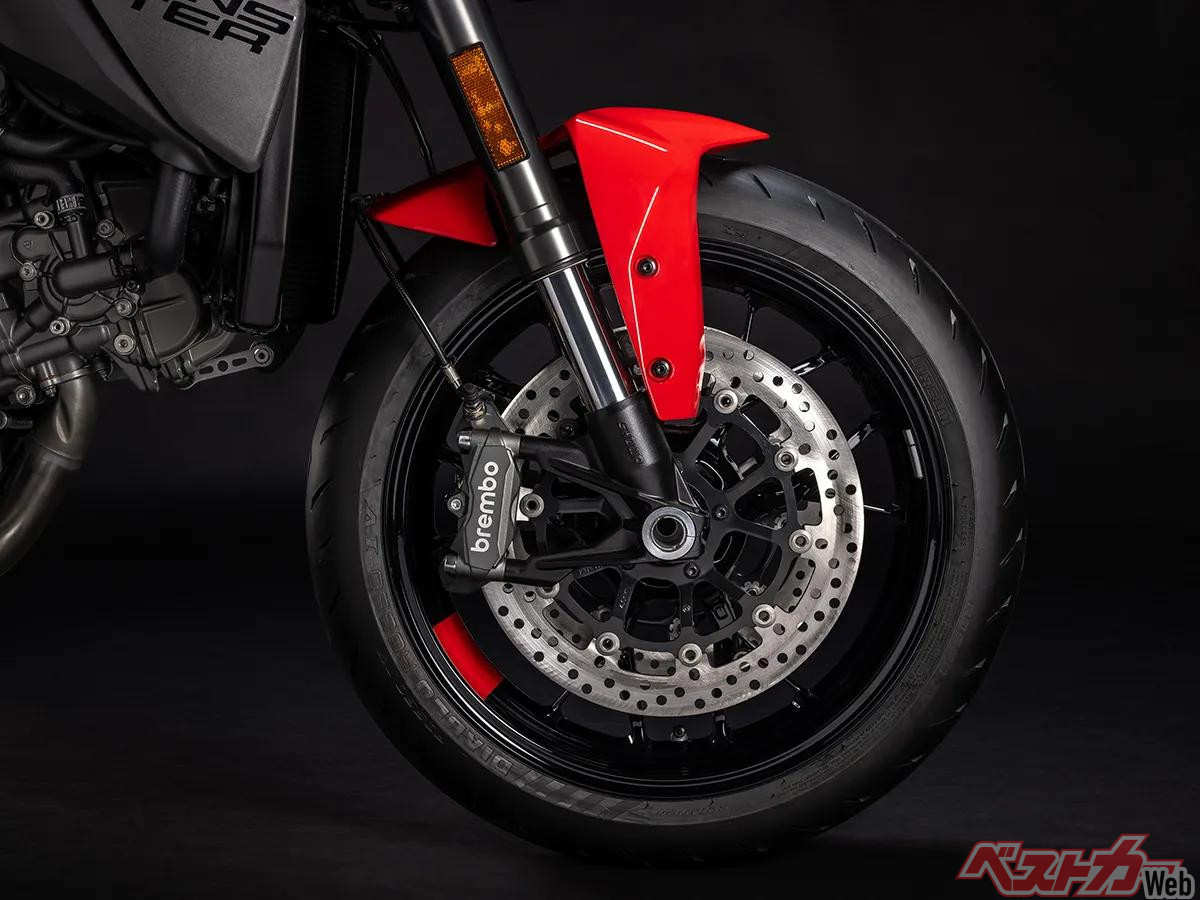 フロントフォークはショーワ製の倒立タイプで、ブレーキはブレンボのM4.32ラジアルキャリパーが採用される。