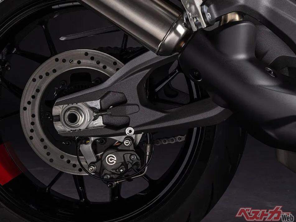 スイングアームはパニガーレV4以降採用されている、大きく肉抜きされたデザインの両持ちタイプとなる。