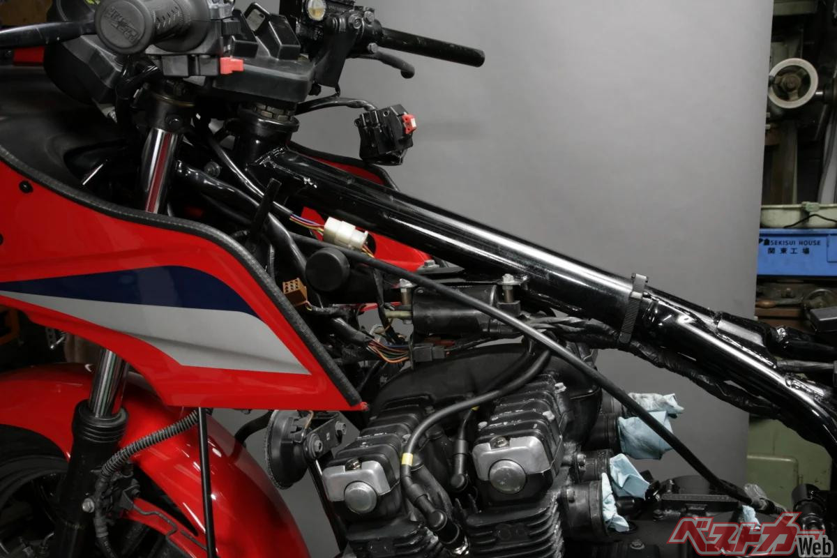 車体から取り外して潤滑油を注入して復元したら以前より重くなってしまった……という時は、ガソリンタンクとフレームの間に挟み込まれていないか、ハーネスと干渉して自由度が損なわれていないかなどを再確認してみましょう。